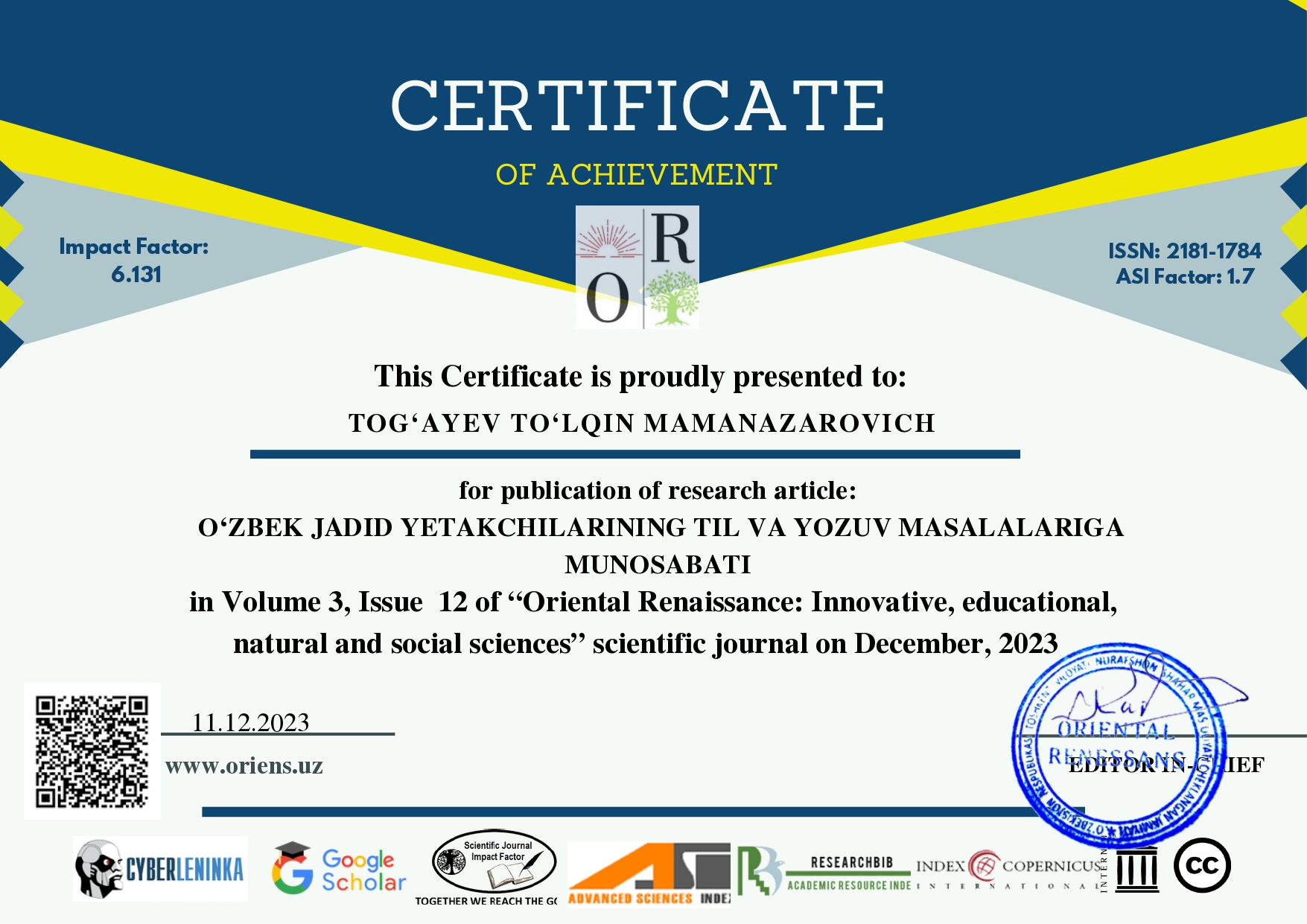 Tog‘ayev To‘lqin Mamanazarovich