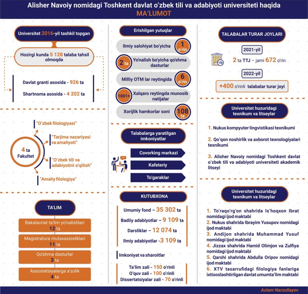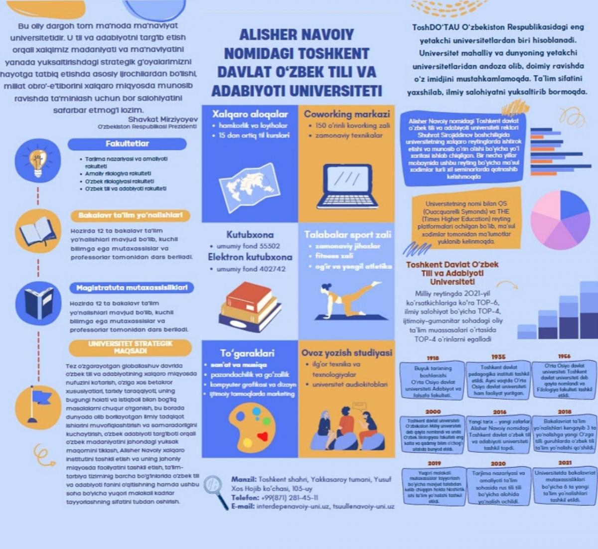 Xabaringiz bor, Alisher Navoiy nomidagi Toshkent davlat oʻzbek tili va adabiyoti universitetining 6 yilligi munosabati bilan 13-20 may kunlari maxsus haftalik e’lon qilindi. Joriy yilning 13-may kuni mazkur maxsus haftalikka start berildi. Mazkur haftalik doirasida dastlab universitet hayoti yoritilgan eng yaxshi infografikalar tanlovi e’lon qilindi. Ushbu tanlovda universitetimizning 6 yillik ish faoliyati davomida qanday yutuqlarga erishgani, respublikamiz va xalqaro maydondagi o‘rni va boshqa jihatlari aks etgan infografikalar qabul qilindi va g‘oliblar aniqlandi.