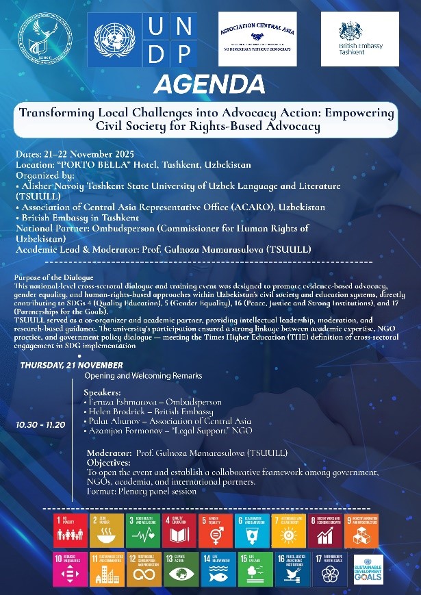 TSUULL plays a national leadership role in strengthening governance by delivering extensive outreach, upskilling, and executive education programmes for policymakers, law-makers, civil servants, and public-sector specialists across Uzbekistan. In parallel, the university conducts policy-focused research in direct collaboration with government departments and national agencies—producing assessment tools, analytical reports, and evidence-based recommendations that shape public-sector reform. Through these combined functions, TSUULL advances SDG 16 by building institutional capacity, informing national policy, and supporting effective, transparent, and accountable governance.