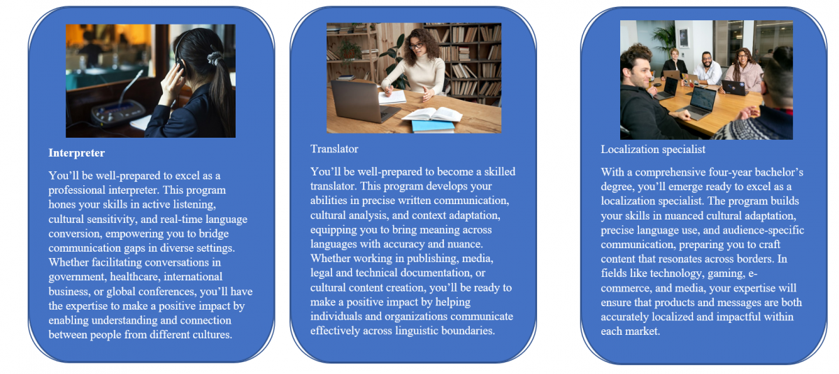 This program enhances creativity, critical thinking, and cross-cultural communication skills, equipping students with a versatile foundation for careers in translation and interpretation, international relations, diplomatic services, cultural organizations, and media. Graduates are prepared to excel in diverse fields, including publishing, linguistics, content creation, and global communications. The curriculum also provides valuable insights into fields like sociology, history, and anthropology, enriching students' understanding of the nuances essential to professional translation and cultural mediation..