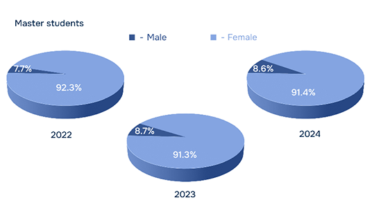 "Over the 2022-2024 period, TSUULL has witnessed a powerful and consistent trend toward greater female participation in core academic programs. Tracking the female proportion in Bachelor's programs (KPI) reveals a significant intensification of the female majority, growing from 91.2% to 96.4%, indicating a strong and increasing preference among young women for our undergraduate offerings. Similarly, the female proportion in Master's programs (KPI) demonstrates robust and stable female dominance, consistently averaging 91.7% over three years. This sustained performance across both levels is a direct result of our targeted outreach and inclusive admissions policies.