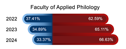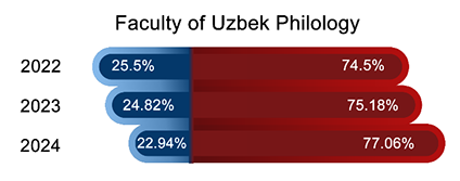 "Our faculty-level analysis, tracked through the annual female enrollment rate per faculty (KPI), confirms that the increase in female enrollment is a university-wide phenomenon. The results show a positive growth trend observed in all 5 faculties from 2022 to 2024. Furthermore, when measuring the strength of female representation (KPI), the data is compelling: 4 out of 5 faculties have a female student body exceeding 65%, with the Faculties of Uzbek Language and Literature and Distance Education both exceeding 85%. This validates that our commitment to gender inclusivity is effectively embedded across all academic disciplines."