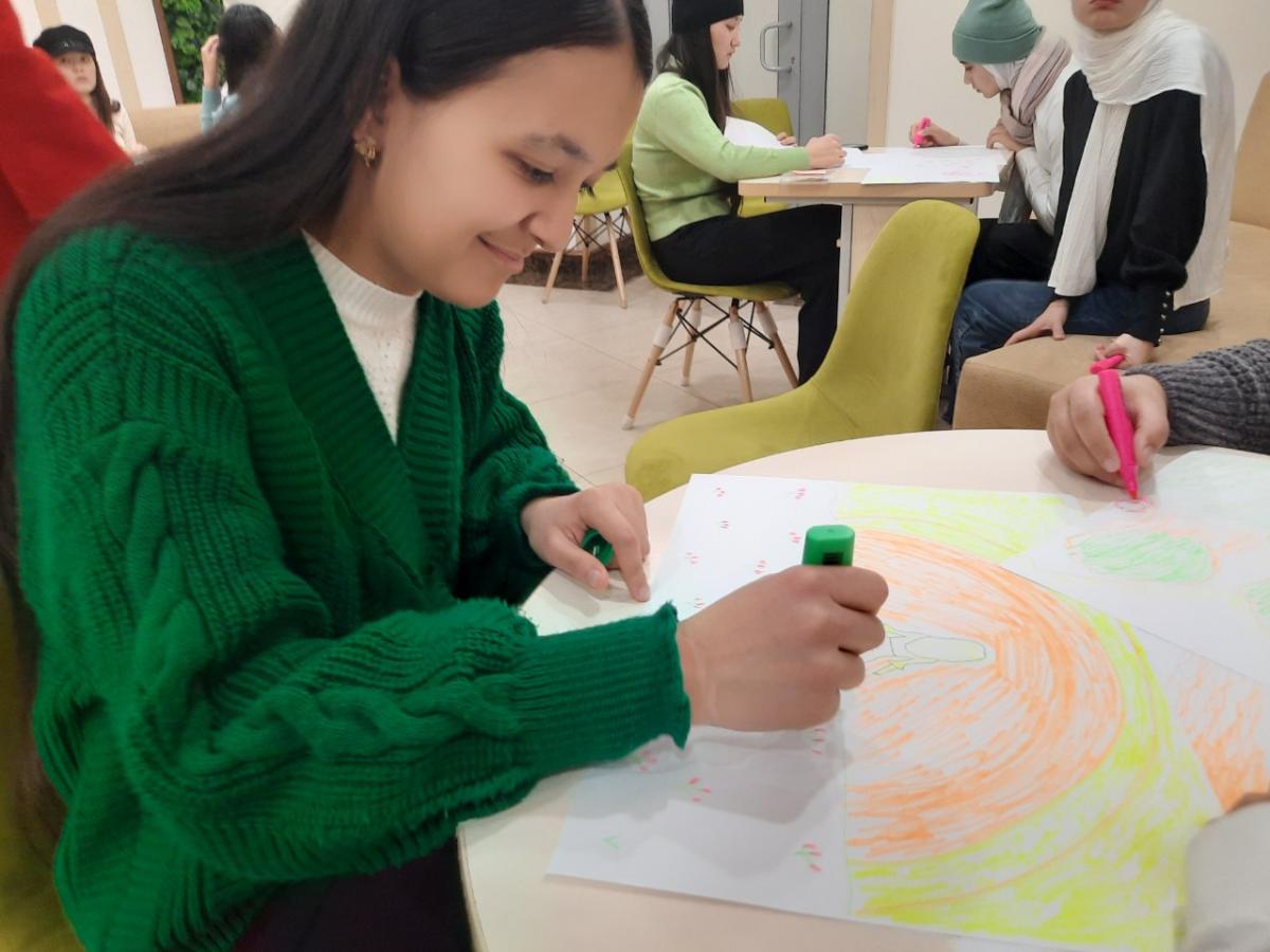 Talaba qizlar treningda o'zlarining qobiliyatlarini o'zlari uchun ham kashf etdilar. Ranglar ularning kayfiyatlarini aks ettirsa, shakllar ularning ruhiy holatlarini ko'rsatadi.
