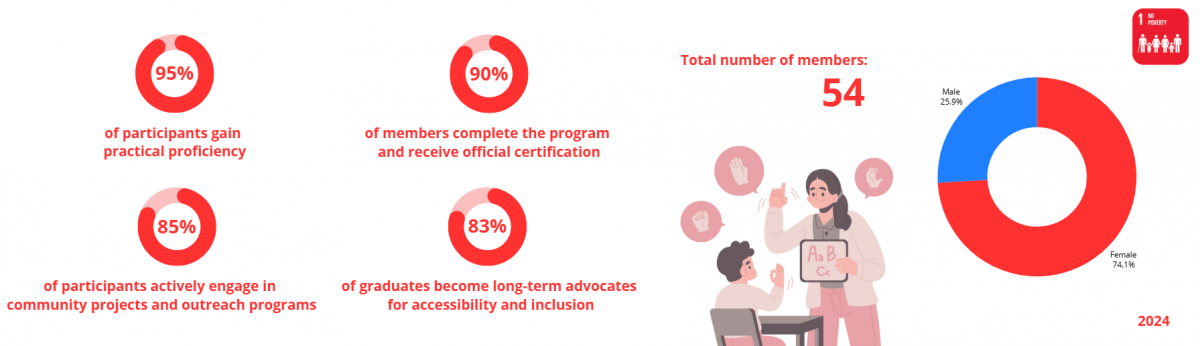 The program also fostered meaningful community engagement, with 85% of participants actively contributing to outreach projects and initiatives supporting people with hearing impairments. Additionally, 83% of graduates became long-term advocates for accessibility and inclusion, carrying their skills and commitment into wider educational and community contexts. These outcomes highlight the Club’s impact in empowering members and promoting a more inclusive society.