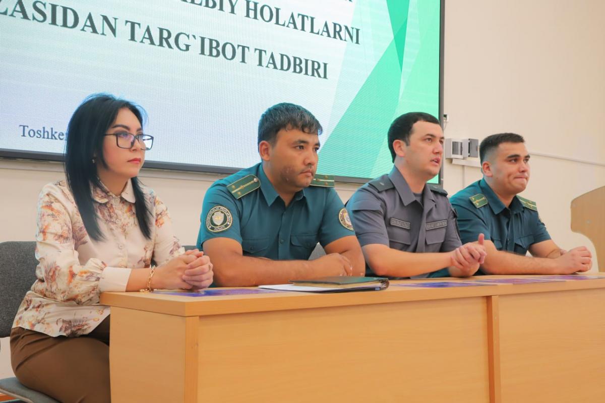 Alisher Navoiy nomidagi Toshkent davlat o‘zbek tili va adabiyoti universitetida joriy yilning 8-sentyabr kuni shu yo‘nalishda muhim tadbir o‘tkazildi. Unda Toshkent shahar Yakkasaroy tumani IIO FMB rahbariyati hamda mas’ul xodimlar ishtirokida “Ta’lim muassasalarida giyohvandlik jinoyatchiligi va salbiy holatlarning oldini olish” mavzusi muhokama qilindi.