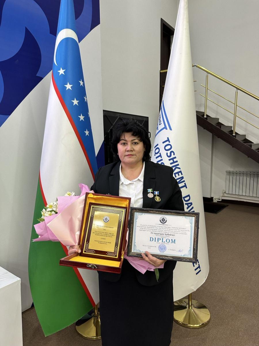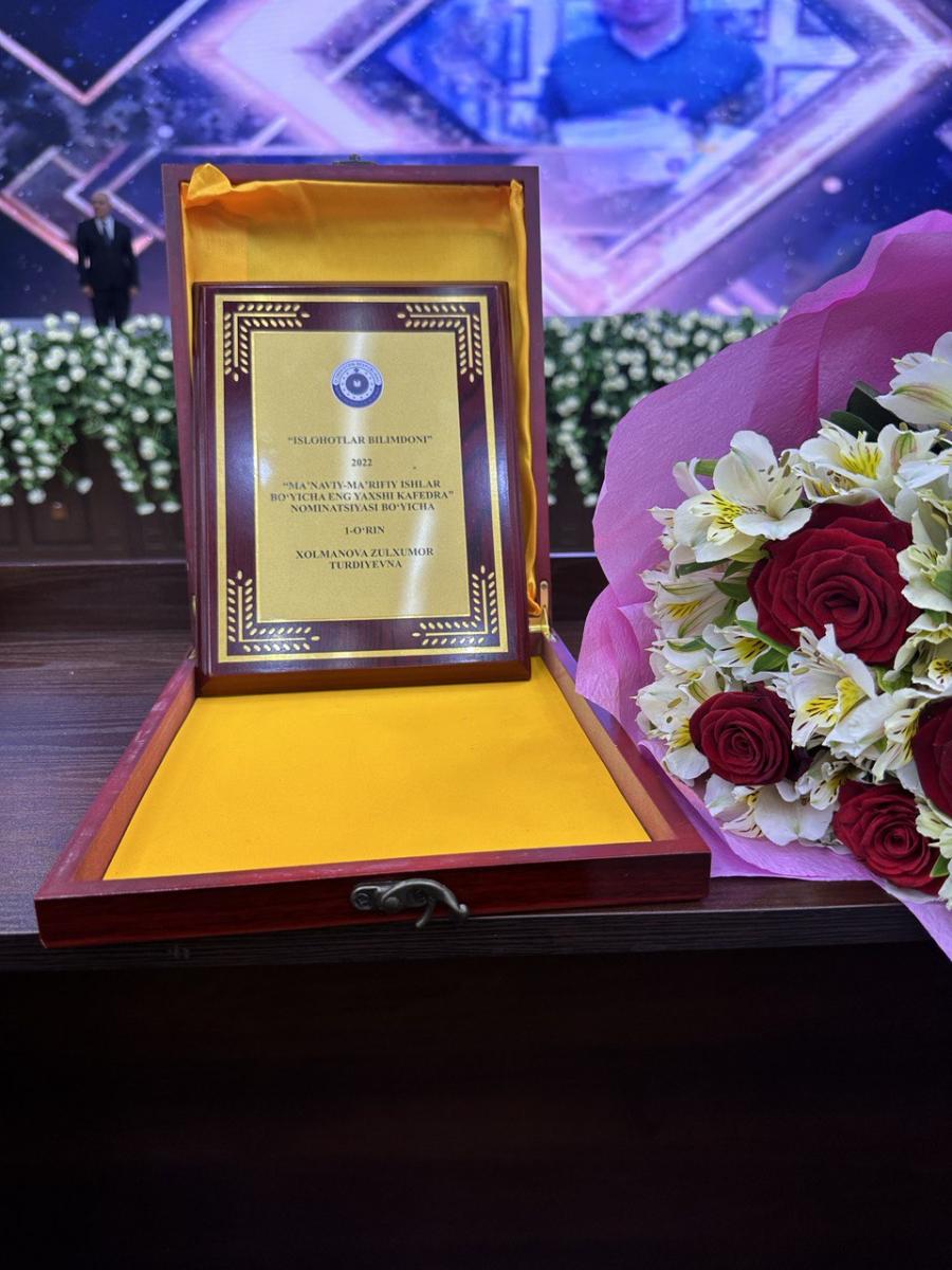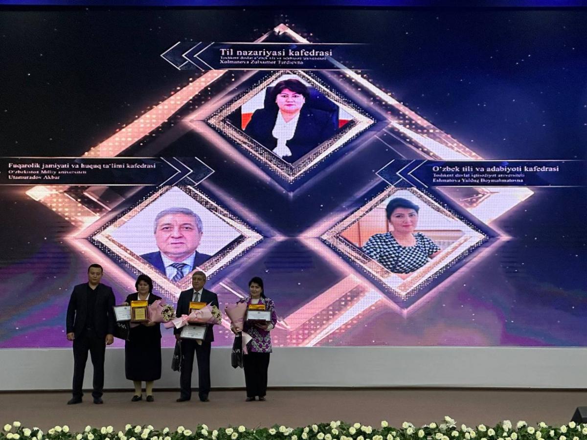 Xususan, joriy o'quv yilida “Islohotlar bilimdoni” respublika koʻrik-tanlovining “Ma’naviy-ma’rifiy ishlar bo‘yicha eng yaxshi kafedra” nominatsiyasida faxrli birinchi o'rinni qo'lga kiritgan universitetimizning Til nazariyasi kafedrasi mudiri filologiya fanlari doktori, professor, O'zbekistonda xizmat ko'rsatgan yoshlar murabbiysi Zulxumor Xolmanovaga mukofotlari tantali topshirildi.