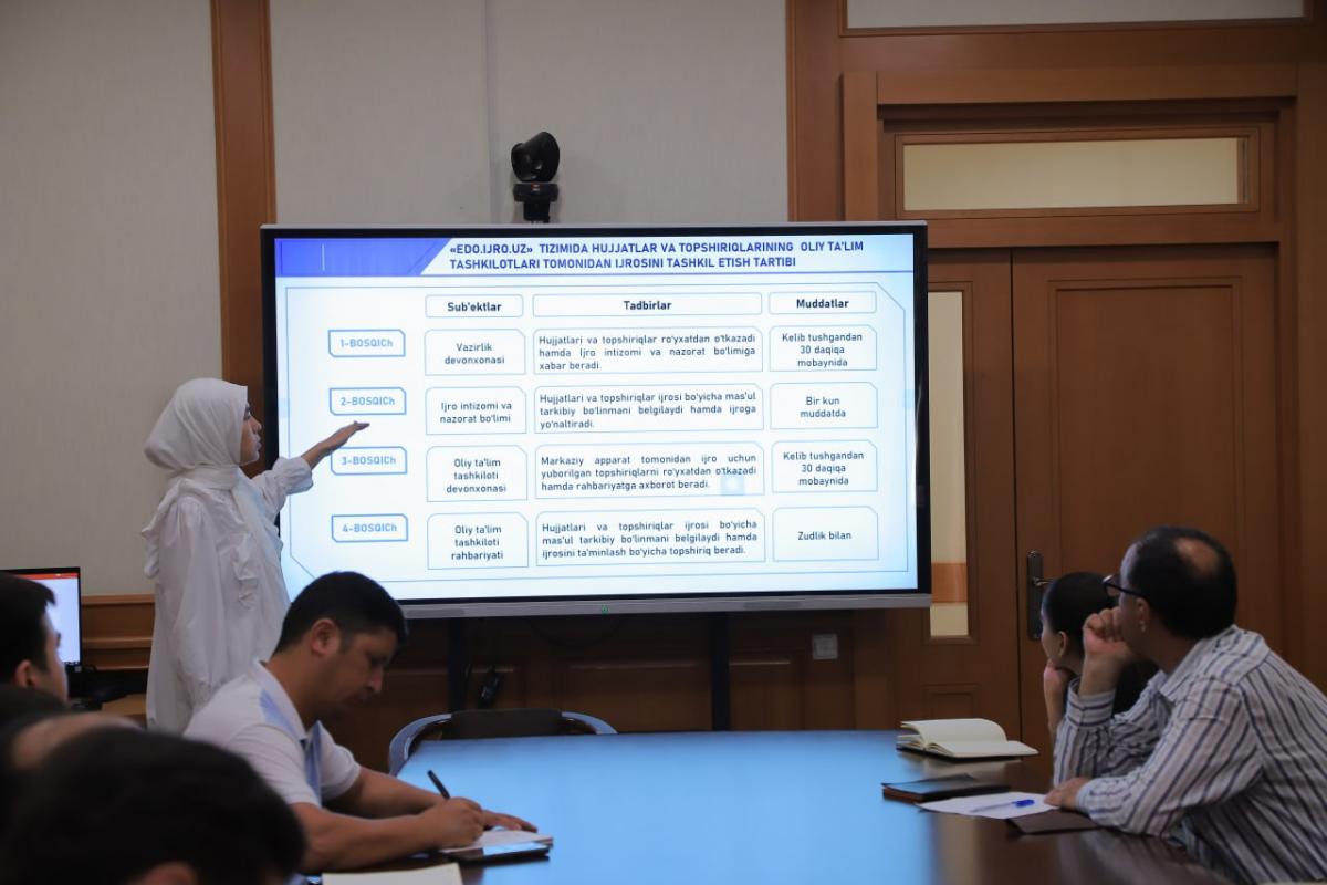 Tadbirga O‘quv ishlari bo‘yicha prorektor O. Davronov raislik qildi. U o‘z nutqida belgilangan topshiriqlarni so‘zsiz bajarish, mas’uliyatni oshirish hamda samarali ijro intizomini ta’minlash zarurligini ta’kidladi. Seminar yakunida ishtirokchilarga kelgusi muddatlar va bajarilishi kutilayotgan natijalar yuzasidan ko‘rsatmalar berildi.