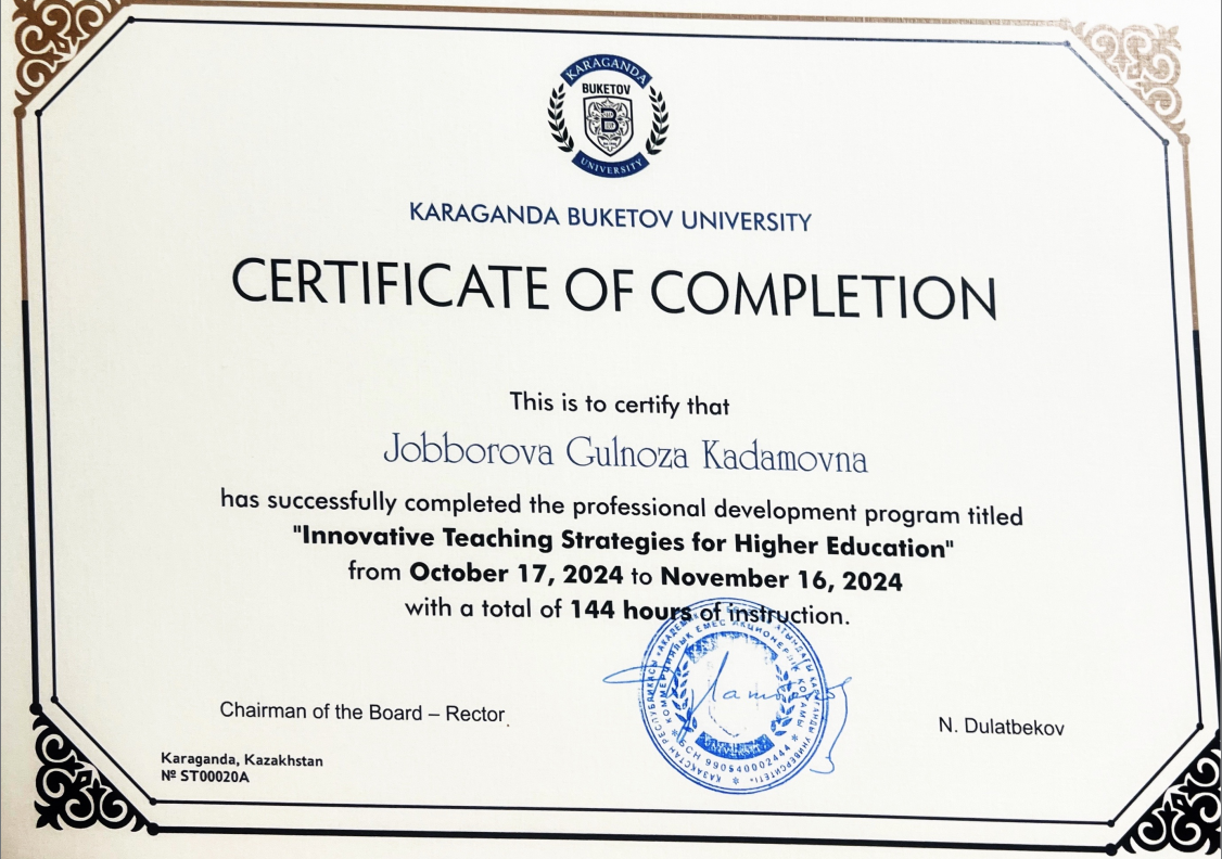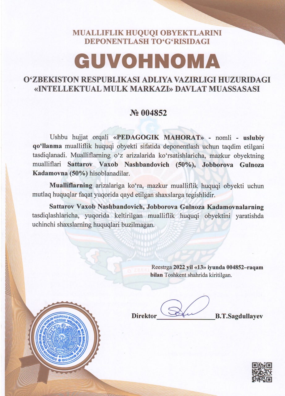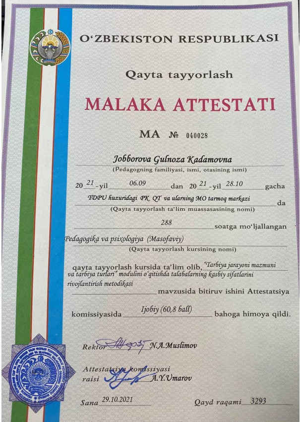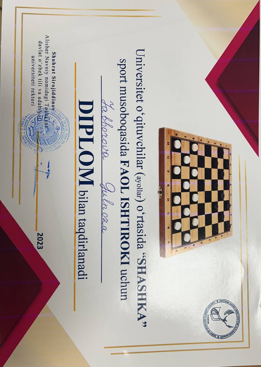 Toshkent toʼqimachilik va yengil sanoat instituti YeSTD fakulьteti «Pedagogika va jismoniy madaniyat» kafedrasi katta oʼqituvchisi