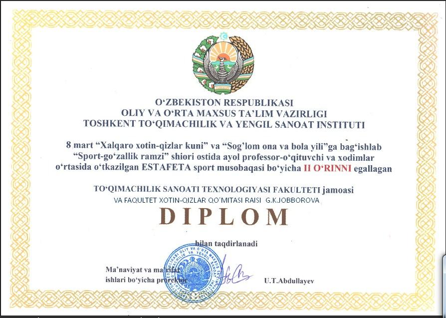 Toshkent toʼqimachilik va yengil sanoat instituti YeSTD fakulьteti «Pedagogika va jismoniy madaniyat» kafedrasi assistenti