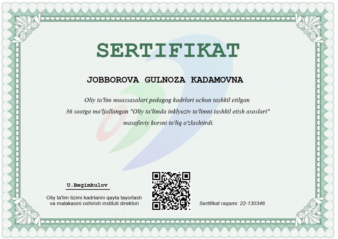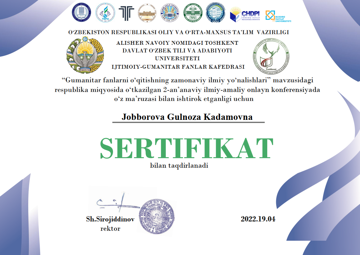 Аlisher Navoiy nomidagi Toshkent davlat oʼzbek tili va adabiyoti universiteti “Ijtimoiy gumanitar fanlar” kafedrasi katta oʼqituvchisi