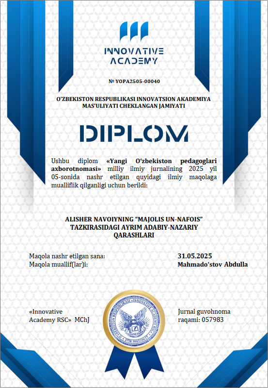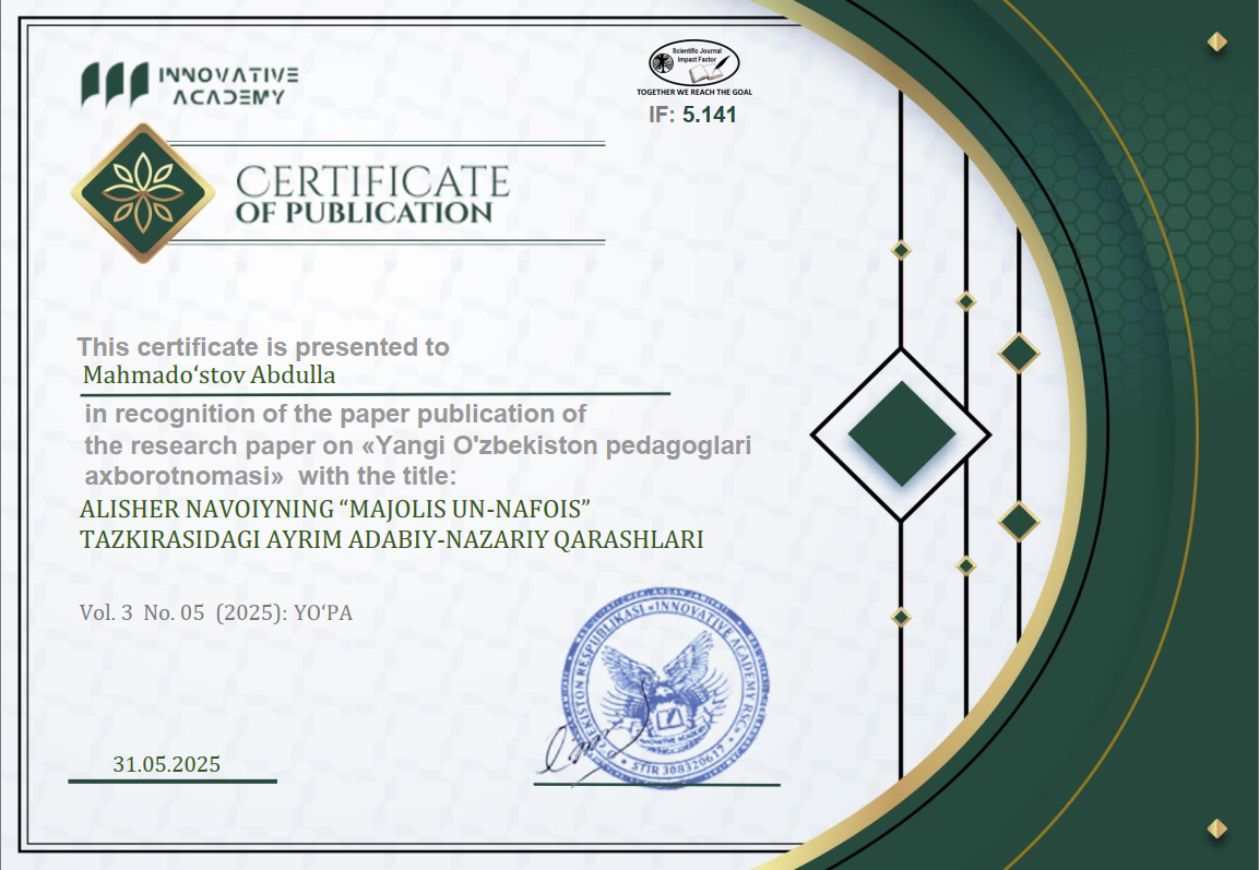 Alisher Navoiy nomidagi Toshkent davlat o‘zbek tili va adabiyoti universiteti stajyor-o‘qituvchi lavozimida ishlab kelmoqda