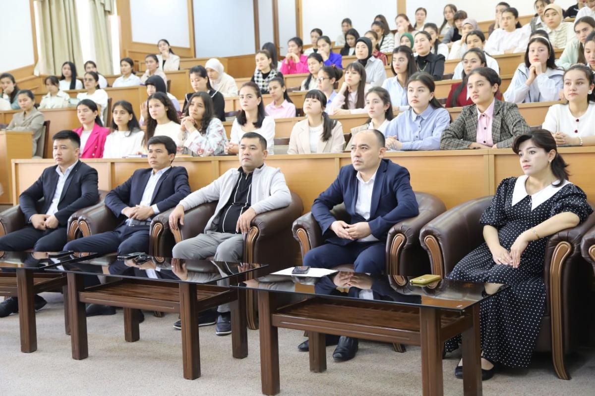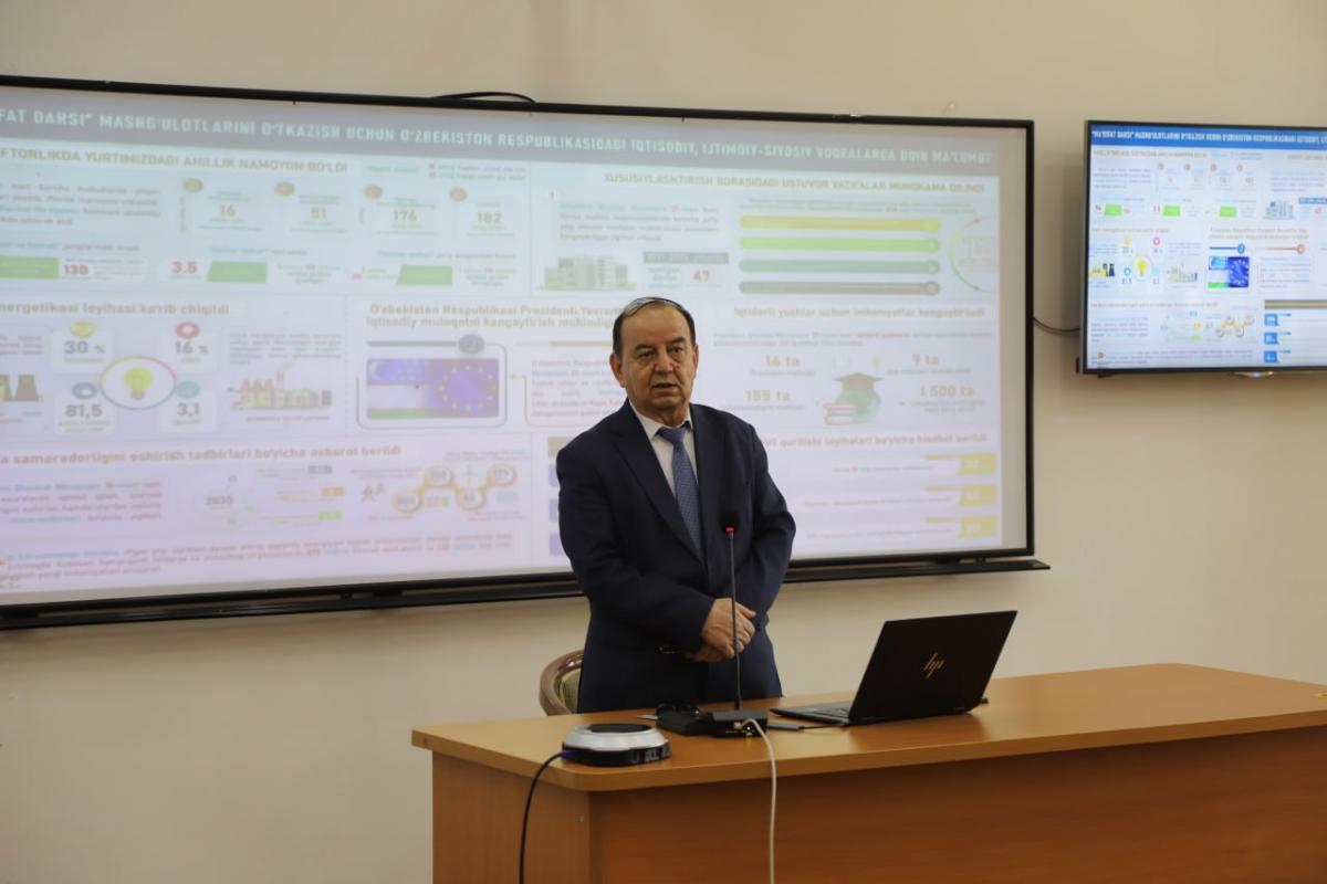 Professor Islomjon Yoqubov o‘z ma’ruzasida ilm-ma’rifatning jamiyat taraqqiyotidagi o‘rni, o‘zbek adabiyotining tarixiy ildizlari va uning bugungi kundagi ahamiyati haqida batafsil so‘z yuritdi. U o‘zbek tili va adabiyotining boy merosi, ulug‘ mutafakkirlarning asarlari hamda ularning yosh avlod tarbiyasidagi ta’siri haqida qiziqarli fikrlar bildirdi. Shuningdek, dars davomida milliy o‘zlikni anglash, tafakkur va ma’naviyatning inson hayotidagi o‘rni keng yoritildi.