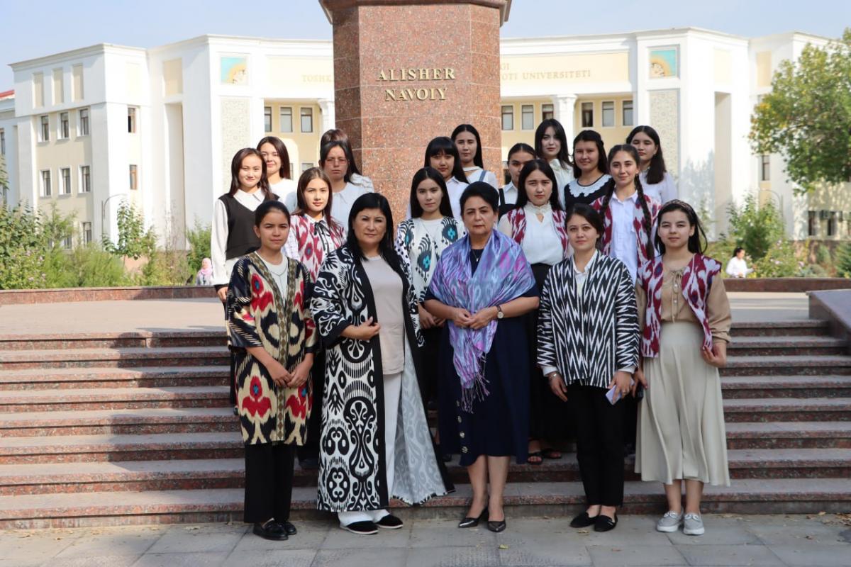 Universitetimizda milliy liboslar haftaligi davom etmoqda. Bugun ham talaba qizlarimiz va ustozlarimiz bajonidil milliy liboslarni faxr bilan egnilariga kiyib, dars mashg'ulotlariga kirishdi. Darslar yakuniga yetgach iqtidorli qizlarimiz tashabbusi bilan Navoiy bobomiz haykali poyida g'azalxonlik tashkil etildi. Mumtoz adabiyotimiz namunalari milliy libosdagi qizlarimiz ijrosida o'zgacha jarang sochdi, desak mubolag'a bo'lmaydi.
