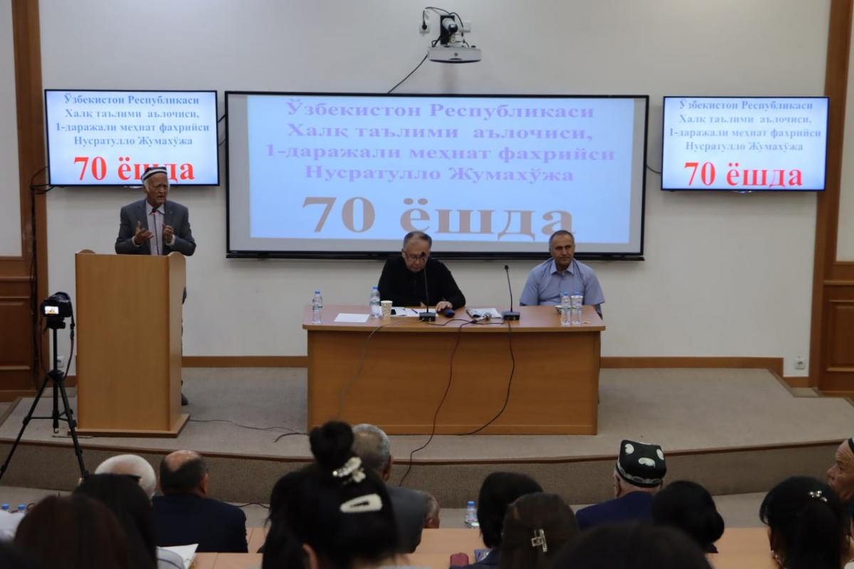 Joriy yilda yetuk navoiyshunos olim, nuktadon ustoz Nusratullo Jumaxo'janing qutlug' 70 yoshni qarshiladi. Bugun universitetimizda olim tavallud kuni munosabati bilan qutlov marosimi bo'lib o'tdi. Marosimda olimning hamkasblari, do'stlari, oila a'zolari, yaqinlari va shogirdlari ishtirok etdi. Tadbirda so'zga chiqqan universitet rektori Shuhrat Sirojiddinov olimning milliy adabiyotimiz tarixini o'rganishdagi xizmatlarini alohida e'tirof etdi "Adabiyot tarixining o’ziga xos nozik jihatlarini o’rganib, mumtoz manbalarimizni tahlil qilishda sizning o’z o’rningiz, betakror uslubingiz bor", dedi u.