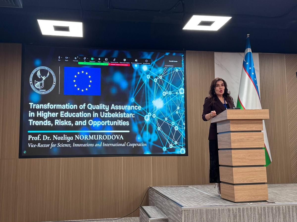 Alisher Navoiy nomidagi Toshkent davlat o‘zbek tili va adabiyoti universitetining ilmiy ishlar va innovatsiyalar bo‘yicha prorektori, professor va HERE milliy eksperti Nozliya Normurodova 2025-yil 27–28-noyabr kunlari SARBON Universitetida o‘tkazilgan “Oliy ta’limni rivojlantirish istiqbollari” yillik konferensiyasida “O‘ZBEKISTON OLIY TA’LIMIDA SIFATNI TA’MINLASH TIZIMINING O‘ZGARISHI: TENDENSIYALAR, EHTIMOLIY XAVFLAR VA IMKONIYATLAR” (“Transformation of Quality Assurance in Higher Education in Uzbekistan: Trends, Risks, and Opportunities”) mavzusidagi ma’ruzasi bilan ishtirok etdi. Anjuman Oliy ta’lim, fan va innovatsiyalar vazirligi, O‘zbekiston Ta’limni rivojlantirish respublika ilmiy-metodik markazi, O‘zbekiston Milliy kutubxonasi, Erasmus+ Milliy ofisi, HERE ekspertlari guruhi, SARBON Universiteti, Toshkent axborot texnologiyalari universiteti va “E-LINE PRESS” MCHJ hamkorligida tashkil etildi. N. Normurodova o‘z ma’ruzasida O‘zbekiston oliy ta’limida sifat kafolatini modernizatsiya qilish jarayonini, global tendensiyalar bilan uyg‘unlashuv yo‘nalishlarini, mavjud xavf-xatarlarning oldini olish mexanizmlarini va ta’lim tizimi uchun yuzaga kelayotgan yangi imkoniyatlarni ilmiy-amaliy tahlil asosida yoritdi. U sifat kafolati tizimining mazmuniy yangilanishi, ichki va tashqi baholash mexanizmlarining takomillashuvi, reytinglar bilan ishlash madaniyati va raqamli monitoringning ahamiyati haqida batafsil fikr bildirdi. Shuningdek, oliy ta’lim muassasalarining global standartlarga moslashuvi uchun zarur bo‘lgan institutsional islohotlar ham taqdimotda asoslab berildi.