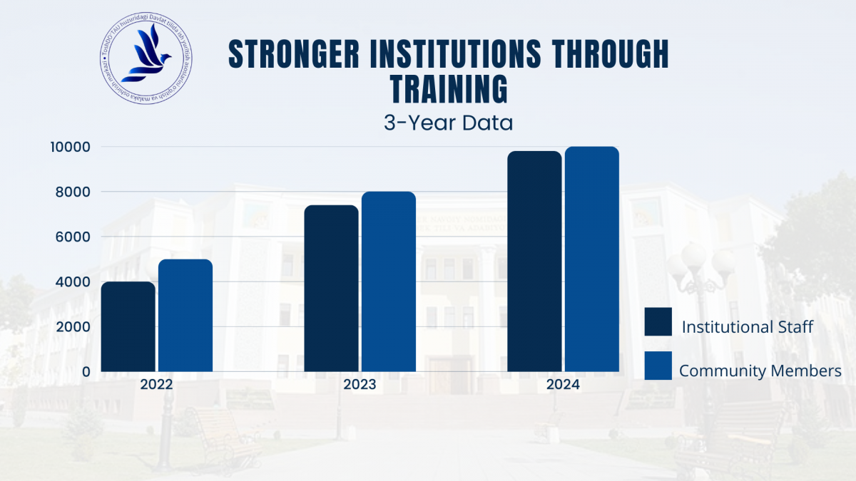 Since its founding, the Center has trained and certified more than 40,000 participants, offering accessible, high-quality short courses and professional development opportunities for public- and private-sector employees, educators, and community members. Operating through its main headquarters in Tashkent and 13 regional branches, the Center provides nationwide instructional, methodological, and advisory services, contributing to stronger institutions, informed citizenship, and effective public engagement. Through these efforts, the Center ensures that its training and institutional work is supported by evidence-based research, wide dissemination of best practices, and continual professional dialogue. This reinforces its role as both a training provider and a thought-leader in the national arena of official-language policy and practice.