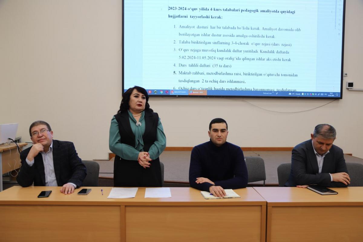 Majlisda fakultet dekani S.Muhamedova, O‘zga tilli guruhlarda o‘zbek tili ta’limi kafedrasi katta o‘qituvchisi A.Davronov pedagogik amaliyotni tashkil qilish tartibi va pedagogik amaliyot yakunida topshirilishi zarur bo‘lgan me’yoriy hujjatlarni taqdimot shaklila ko‘rsatib, tushuntirib berishdi.