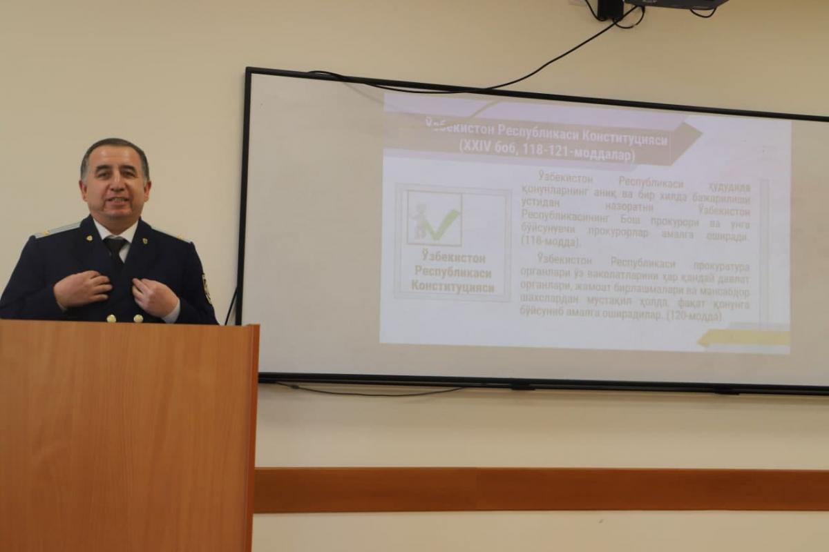Joriy yilning 24-dekabr kunida Alisher Navoiy nomidagi Toshkent davlat oʻzbek tili va adabiyoti universiteti Tarjima nazariyasi va amaliyoti fakultetida “Oʻzbekiston Respublikasi Prokuratura organlari” mavzusida davra suhbati boʻlib oʻtdi. Davra suhbatida Toshkent shahar prokraturasi boʻlim boshligʻi, Adliya maslahatchisi Fayziyev Umarjon Ravshanovich ishtirok etdi va talabalarga Oʻzbekiston Respublikasi Prokuratura tizimi, vazifalari haqida keng maʼlumot berib oʻtdi. Shuningdek ish faoliyati doirasida uchragan turli voqea-hodisalar haqida gapirib berdi. Talabalar prokurorni juda katta qiziqish bilan tingladilar va oʻz fikr-mulohazalarini bildirdilar, turli savollariga javob oldilar.