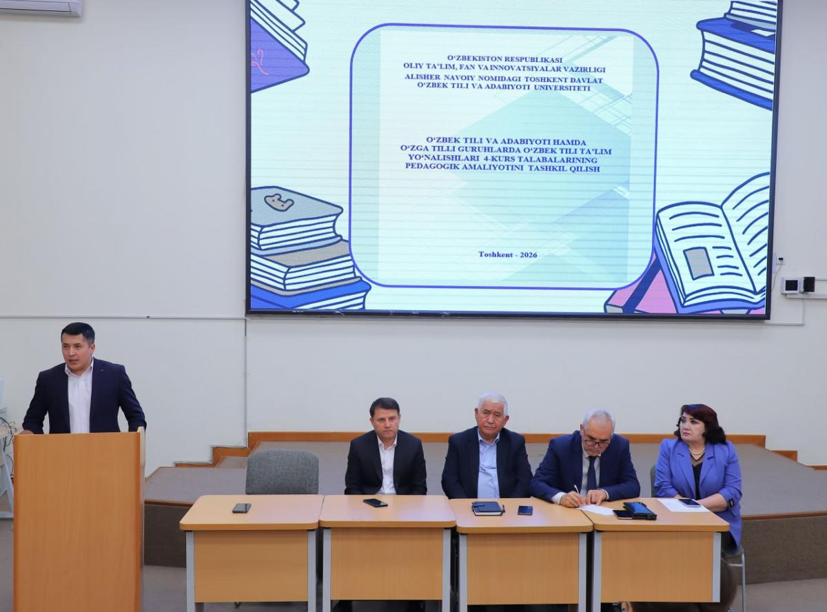 2026-yil 26-yanvar kuni Alisher Navoiy nomidagi Toshkent davlat o‘zbek tili va adabiyoti universitetida O‘zbek tili va uni o‘qitish metodikasi kafedrasi tashabbusi bilan O‘zbek tili va adabiyoti hamda O‘zga tilli guruhlarda o‘zbek tili ta’lim yo‘nalishlari 4-kurs talabalarining pedagogik amaliyotini samarali tashkil etishga bag‘ishlangan anjuman o‘tkazildi. Mazkur tadbir bitiruvchi kurs talabalarini pedagogik faoliyatga tayyorlash, ularning amaliy ko‘nikmalarini mustahkamlash hamda amaliyot jarayonini belgilangan tartib va talablar asosida amalga oshirish masalalarini keng muhokama qilishga qaratildi.