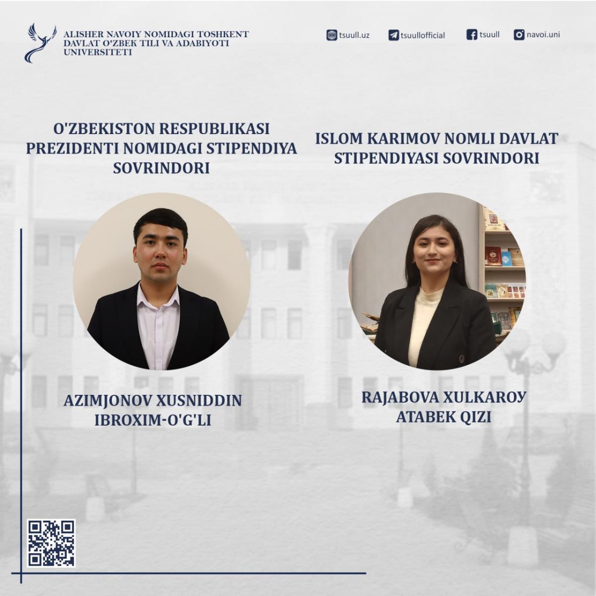 2023/2024-o‘quv yili uchun Alisher Navoiy nomidagi Toshkent davlat o'zbek tili va adabiyoti universiteti bakalavriat bosqichining 8 nafar talabasi O‘zbekiston Respublikasi Prezidenti va nomli davlat stipendiyalariga munosib ko‘rildi.