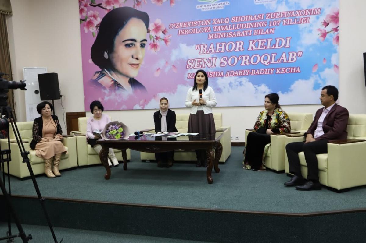 Bugun Respublika Maʻnaviyat va ma rifat markazida Alisher Navoiy nomidagi Toshkent davlat oʻzbek tili va adabiyoti universiteti bilan hamkorlikda shoira Zulfiya Isroilova tavalludining 107 yilligiga bagʻishlangan “Bahor keldi seni soʻroqlab” adabiy-badiiy kecha tashkil etildi. Unda shoirlar, ziyolilar, sheʼriyat ixlosmandlari va talabalar ishtirok etdi.