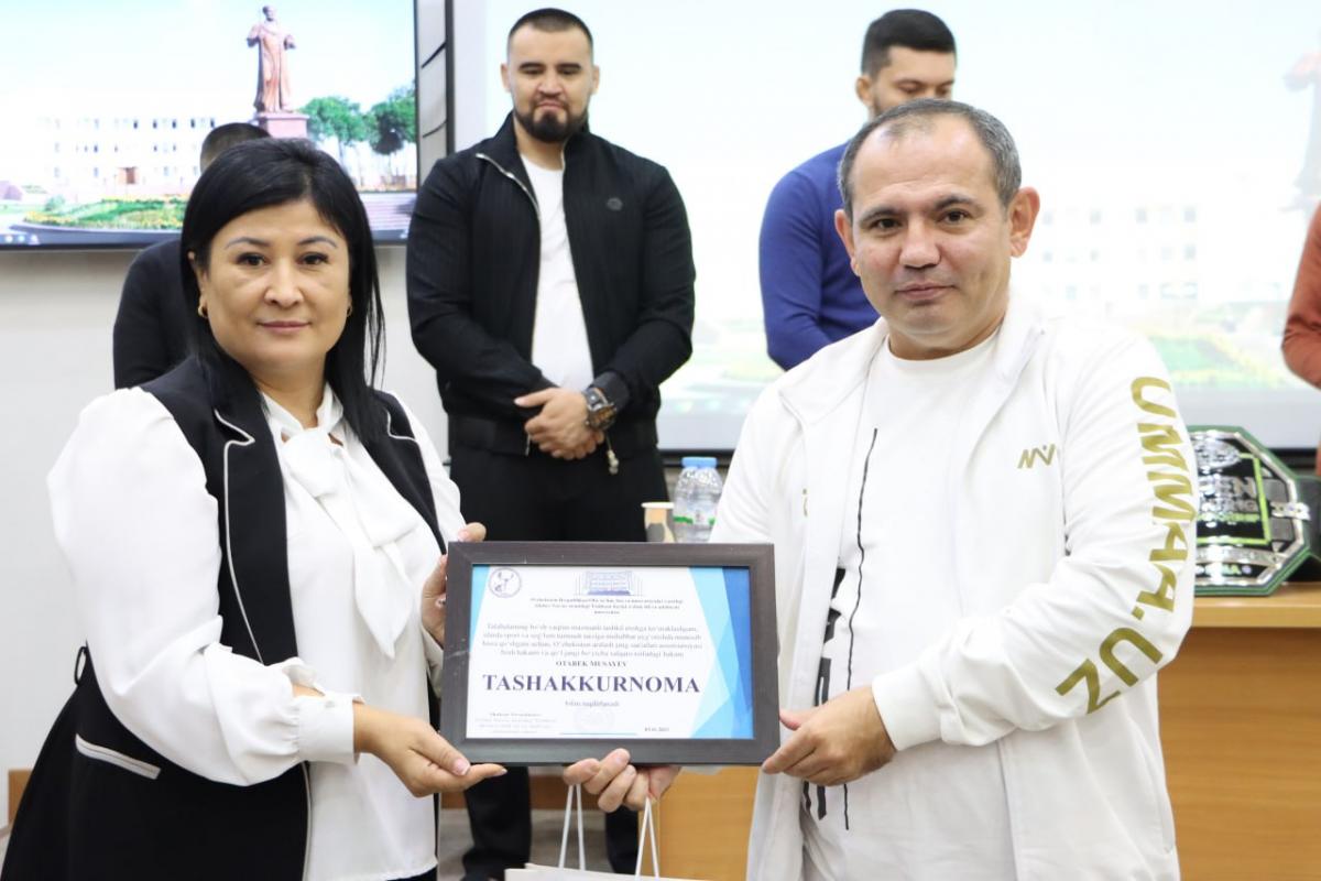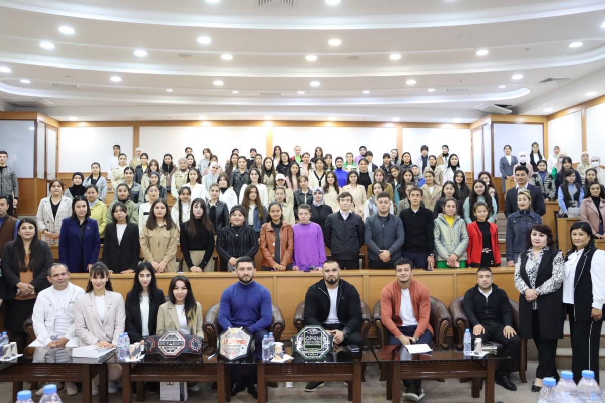 2023- yil 3- noyabr kuni Toshkent davlat o‘zbek tili va adabiyoti universitetida Aralash janglar san’ati bo‘yicha chempionlar, professional jangchilar va universitet talabalarining uchrashuvi bo‘lib o‘tdi. Uchrashuvda O‘zbekiston Aralash janglar san’ati assotsiatsiyasining bosh hakami, xalqaro toifadagi hakam Otabek Musayev, Aralash janglar san’ati bo‘yicha O‘zbekiston terma jamoasining bosh murabbiysi, “Fight baza by Khudyakov” sport klubining asoschisi va direktori Dmitriy Xudyakov, Aralash janglar san’ati bo‘yicha ikki karra jahon chempioni Azamat Nuftullayev, Aralash janglar san’ati bo‘yicha professional jangchilar, bir necha marta jahon, Osiyo, O‘zbekiston chempionlari – Doston Bozorov, Ma’rufjon Mamarazikov, Hilola Sobirova, Umida Abdullayeva, Mushtariy Xodjimuhamedovalar qatnashishdi. Chempionlar va ularning murabbiylari talabalarga sport bilan shug‘ullanishning afzalliklari hamda mashaqqatlari, chempion bo‘lish sirlari, oilasi, bolaligi, qanday mehnatlar evaziga shunday yutuqlarga erisha olganliklari haqida so‘zlab berishdi. Talabalarda, ayniqsa, sportchi-qizlarning chiqishi katta taassurot qoldirdi. Sportchilarning hayotning o‘zi kurashlardan iborat ekanligi, bu kurashlarda yengib chiqish uchun metin iroda, aniq maqsad, xohish-istak bo‘lishi zarurligi, ota-onaga, murabbiyga nisbatan hurmat, mehr-muhabbat ko‘rsatish kerakligi haqidagi motivatsion nutqlari talabalarning qalbiga kirib bordi. Mehmonlar talabalarning savollariga juda qiziqarli va batafsil javoblarni berishdi.