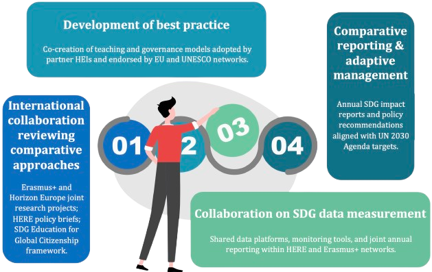 • TSUULL’s comparative analyses and policy-oriented outputs are disseminated globally through international conferences, peer-reviewed publications, and its dedicated SDG web platform, ensuring open access to evidence-based practices, fostering knowledge transfer, and advancing the collective progress of global universities towards the SDGs.