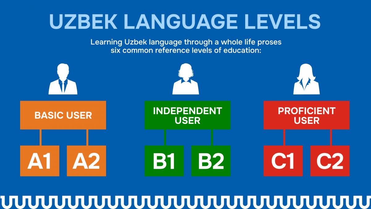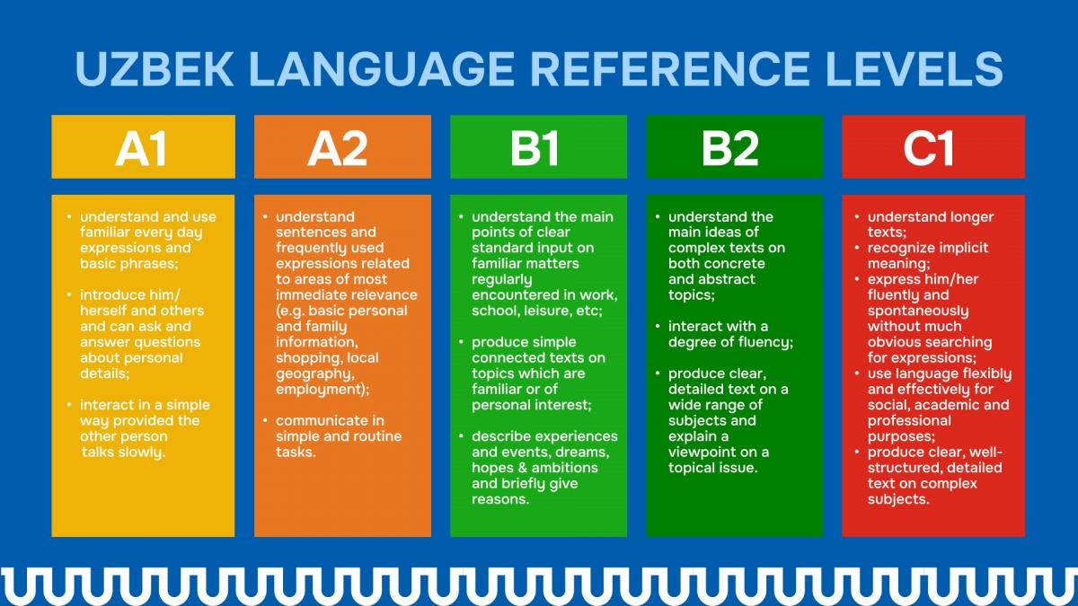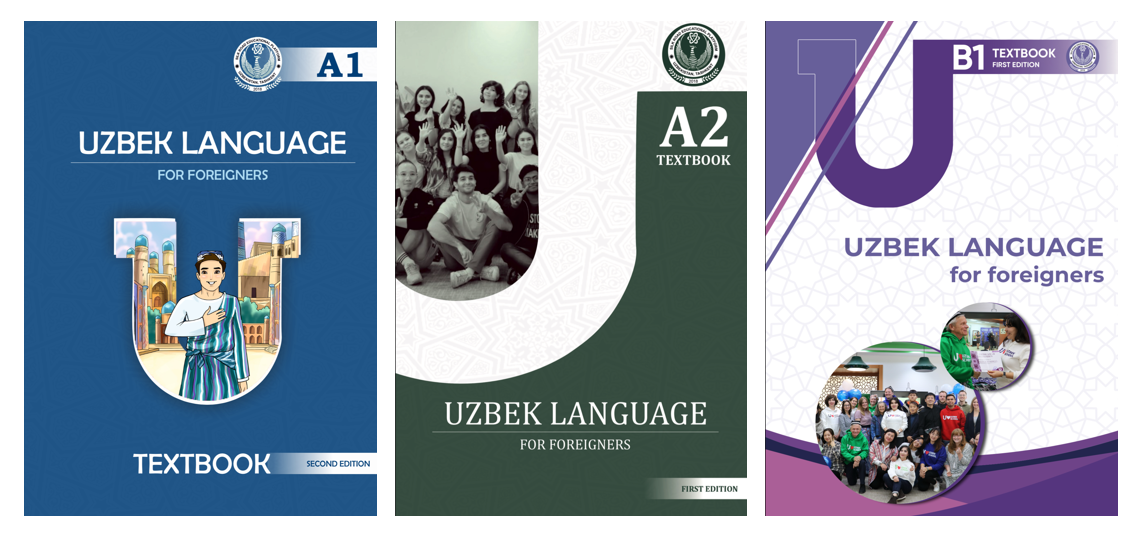 Uzbek language courses are organized in accordance with the Common European Framework of Reference for Languages (CEFR). To date, textbooks for A1, A2, and B1 proficiency levels have been developed and introduced into practice. For each level, specialized study plans of 3-month, 5-month, and 12-month duration have been elaborated. The textbooks include: