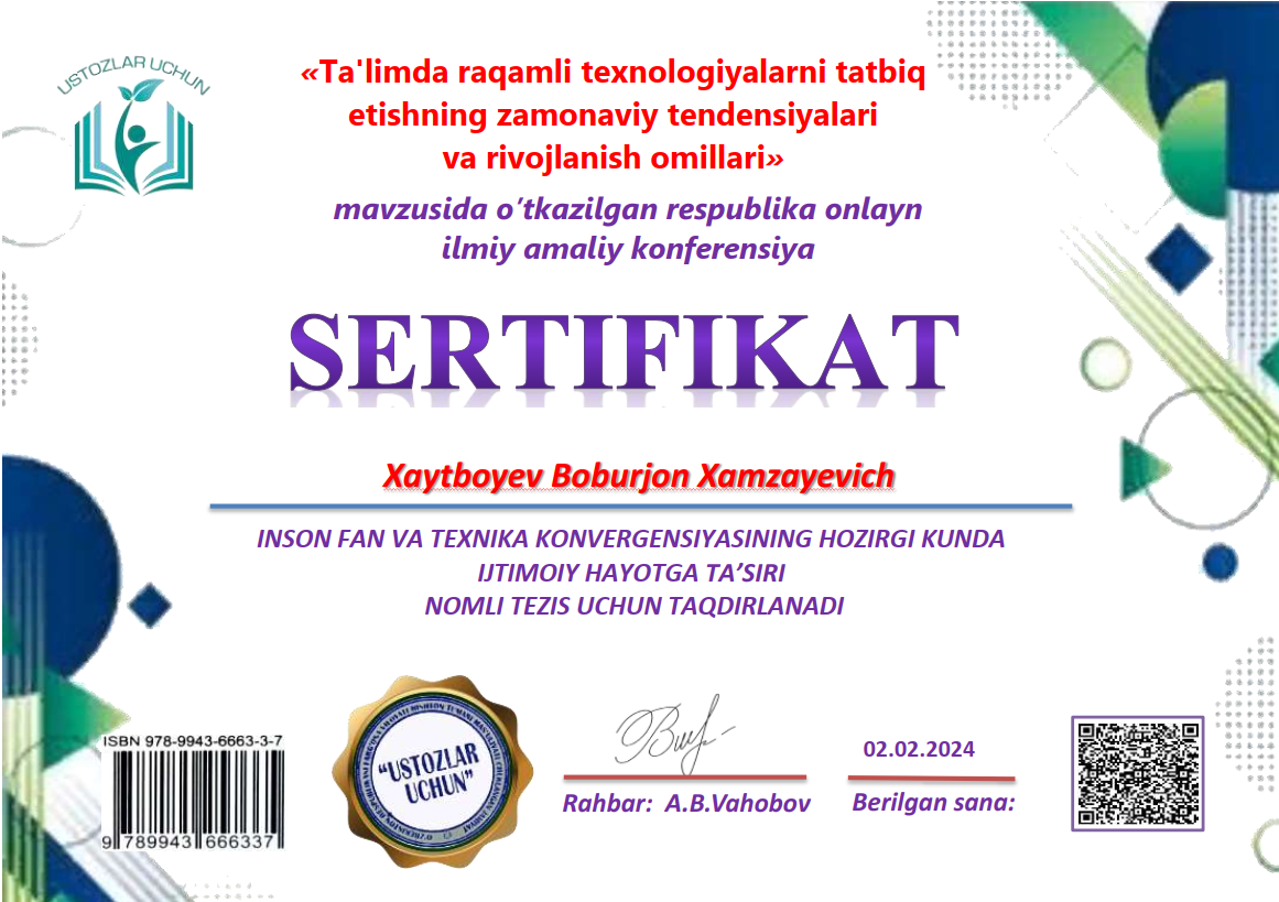 Falsafa (Qo‘llash sohasi) mutaxassisi. Mirzo Ulug‘bek nomidagi UzMU