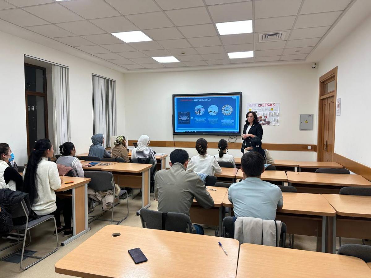 Dars mobaynida yangi tahrirdagi O‘zbekiston Respublikasi Konstitutsiyasi, uning bugungi kundagi dolzarb ahamiyatli xususiyatlari va inson huquqlari garovining bosh omili ekanligi ta’kidalanib, inson huquqlari doirasida olib borilayotgan islohotlarning asosi “Yangi O‘zbekiston” ekanligi talabalarga ma’ruzalar va slaydlar orqali tushuntirildi.