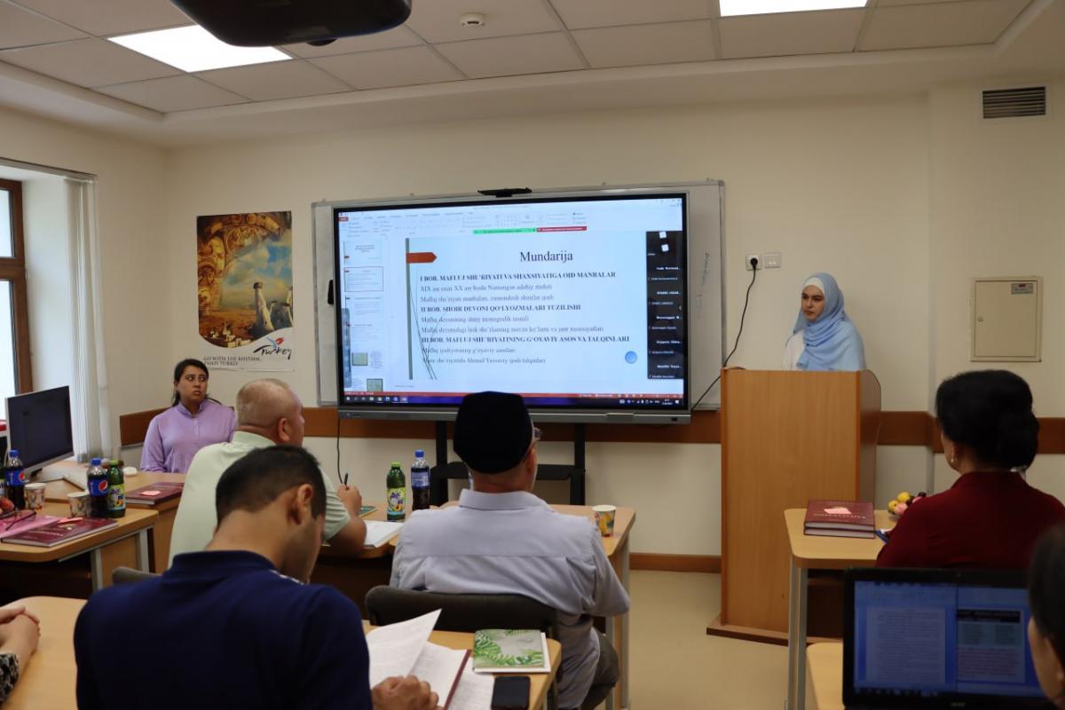 Alisher Navoiy nomidagi Toshkent davlat O‘zbek tili va adabiyoti universiteti Ijtimoiy-gumanitar fanlar va axborot texnologiyalari fakulteti Matnshunoslik va adabiy manbashunoslik kafedrasida magistrantlarning 70230301 – Matnshunoslik va adabiy manbashunoslik mutaxassisligi bo‘yicha magistr darajasini olish uchun yozgan dissertatsiyalari himoyasi davom etmoqda. Bugun navbatdagi magistrantlarning ilmiy ishlari muhokama qilindi. Jumladan, magistrant Kabilov Abdulbosit Badretdinovichning “Mavludi Nabiy turkumidagi adabiy manbalarning matniy tadqiqi”, Fayoziy Najmiddin Nuriddin o‘g‘lining “O‘rta Osiyo xattotlik tarixi va asosiy xat turlarining shakllanishi”, Ibragimov Shomirza Nurmirza o‘g‘lining “Unvonud dalil” asarida xattotlik masalalarining yoritilishi”, Boboqulova Gulmira Eshonqul qizining “Mafluj devoni matniy tadqiqi”, Mahamatxonova Muxlisa Axroljon qizining “Saolibiyning “Kanzul kuttab” asarida kotiblar faoliyatining yoritilishi”, Soliyev Elyorbek Muxammatmo‘sa o‘g‘lining “O‘zbekcha tafsirlarning takomil tadriji va matniy xususiyatlari” va Vohidova Muxlisa Abdumalik qizining “Foyiq devoni manbalari tadqiqi” mavzusidagi dissertatsiyalari hay’at a’zolarida katta qiziqish uyg‘otdi va yuqori baholandi.