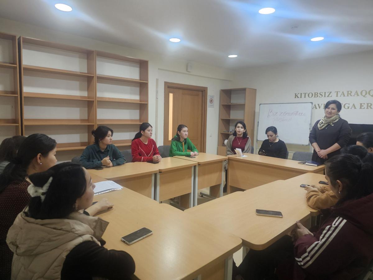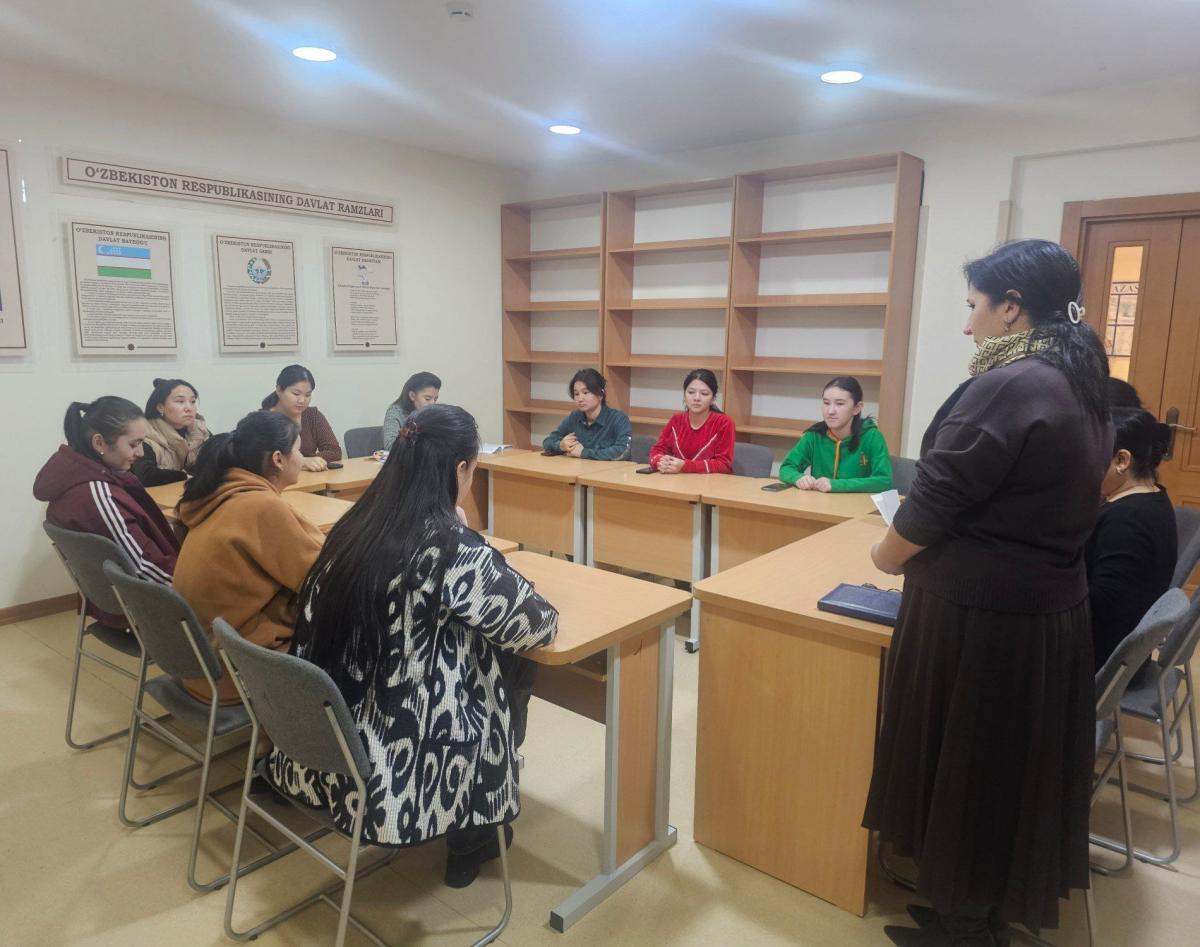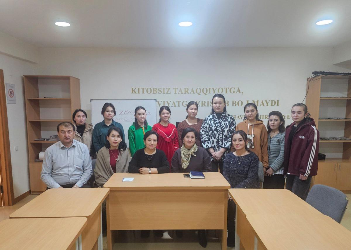 Tarjima nazariyasi va amaliyoti kafedrasi o‘qituvchilari PhD, dotsent Nargiza Rashidova, filologiya fanlari nomzodi, dotsent Nigora Sulaymonova, PhD, dotsent vazifasini bajaruvchi Kamola Abdulloyeva hamda PhD Yorqinoy Ismonova tomonidan talabalar turar joyida “Yoshlar tarbiyasida milliy qadriyatlarning o‘rni” mavzusida ma’naviy-ma’rifiy tadbir tashkil etildi.