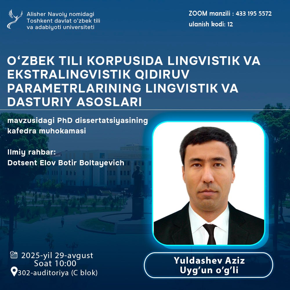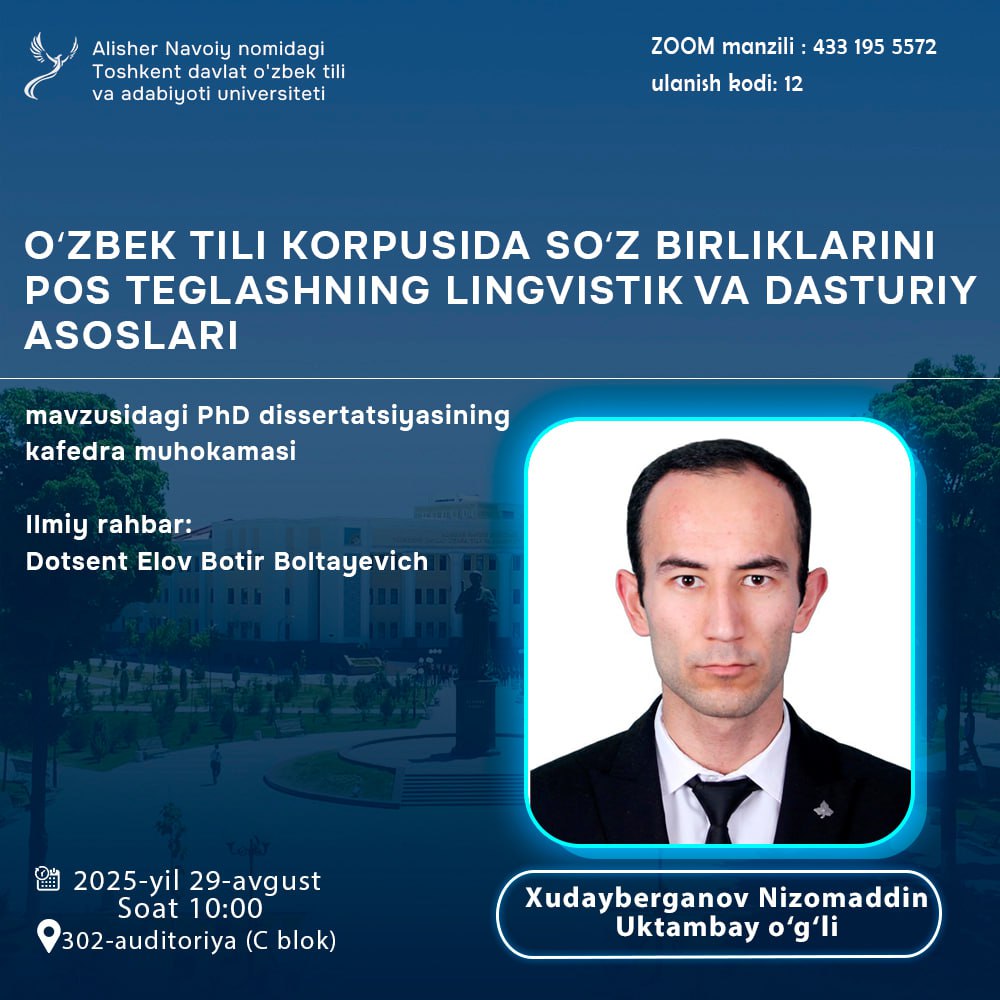 26 Oct 2025 28.08.2025 Nizomaddin Xudayberganovning PhD dissertatsiyasi muhokamasi haqida e'lon Batafsil