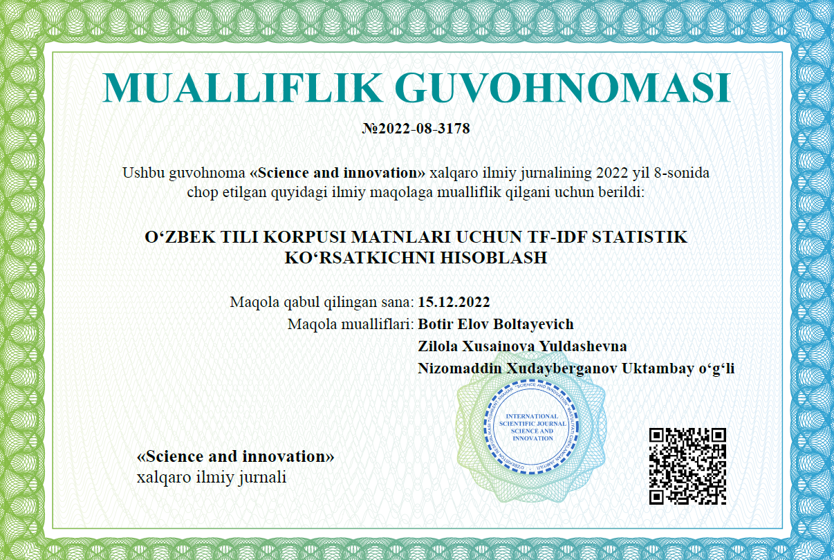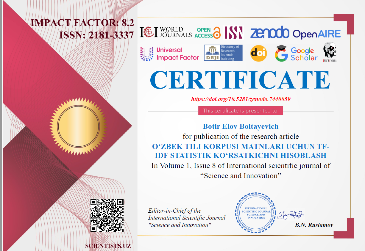 A STATISTICAL INDEX CALCULATED USING THE TF-IDF FOR TEXTS IN THE UZBEK LANGUAGE CORPUS