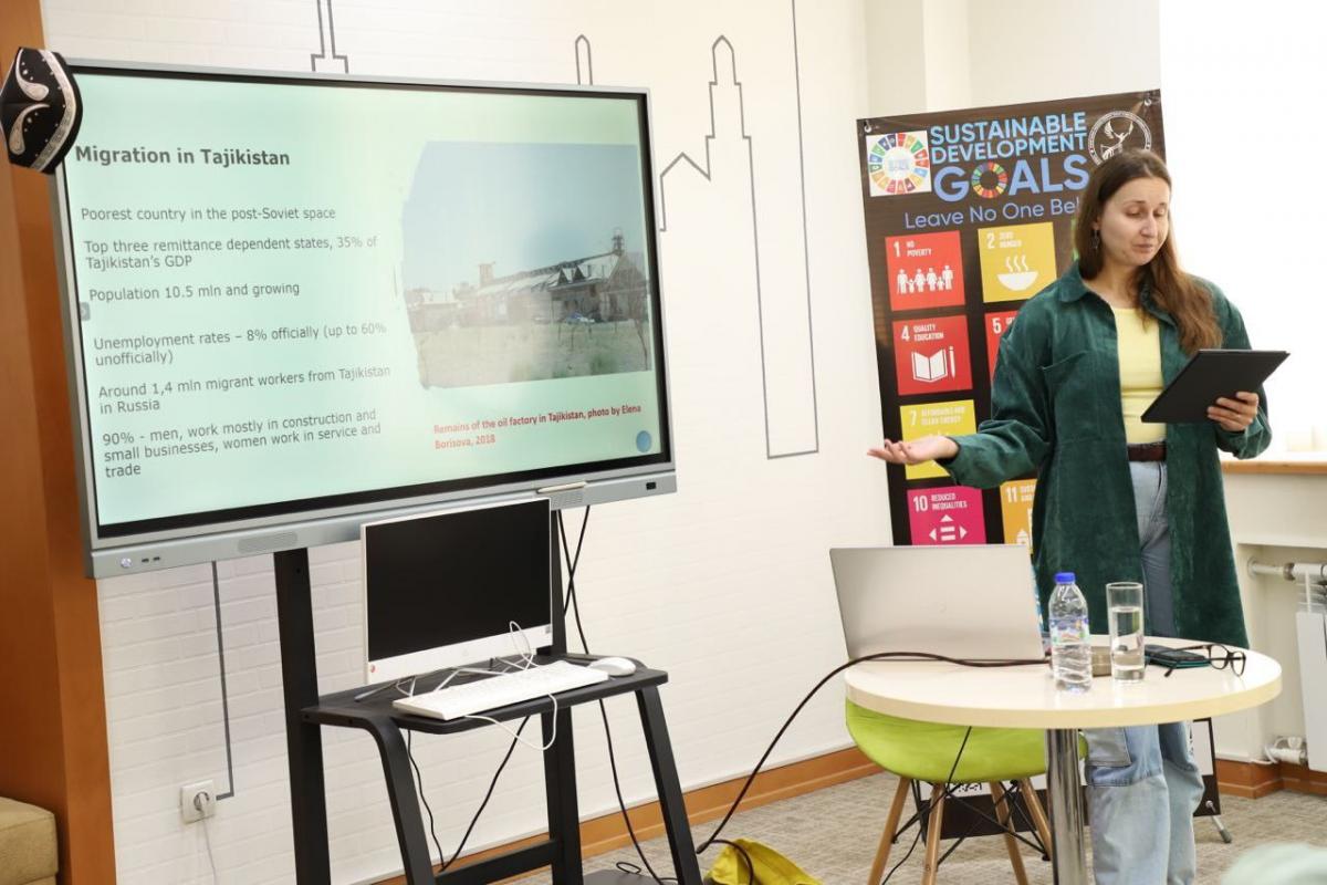 On 6 October 2023, Dr.Elena Borisova, Leverhulme Early Career Fellow, University of Sussex (UK), delivered a guest lecture entitled ‘In Search of the Good Life: Understanding Sociocultural Dynamics of Migration in Central Asia’, which took place at International Office Hall on Friday and provided deep understanding of migration processes in Central Asia on the case of Tajikistan.