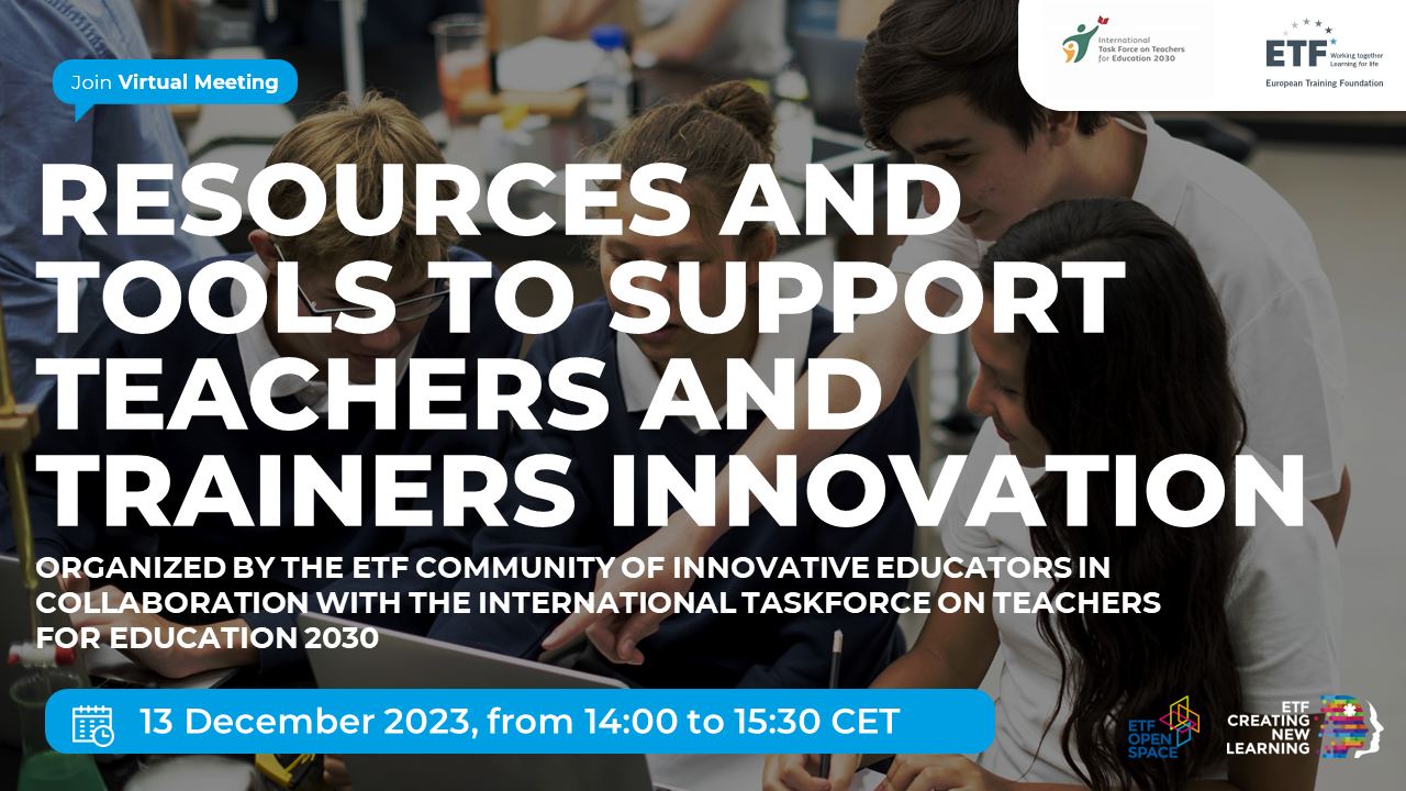 22 Oct 2025 07.12.2023 Online Meeting ‘Resources and tools to support teachers and trainers innovation’, organised by ETF Community of Innovative Educators in collaboration with the International Taskforce on Teachers for Education 2030, 13 December More