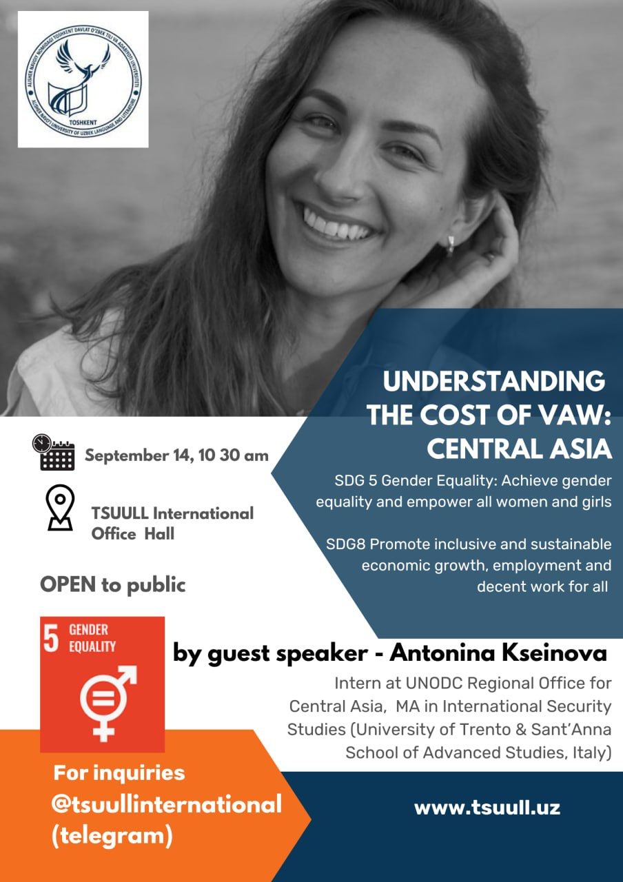 23 Oct 2025 08.09.2023 SDG 5 and SDG 8: Understanding the Cost of VAW: Central Asia – Public-Talk by Antonina Kseinova, 14 September More