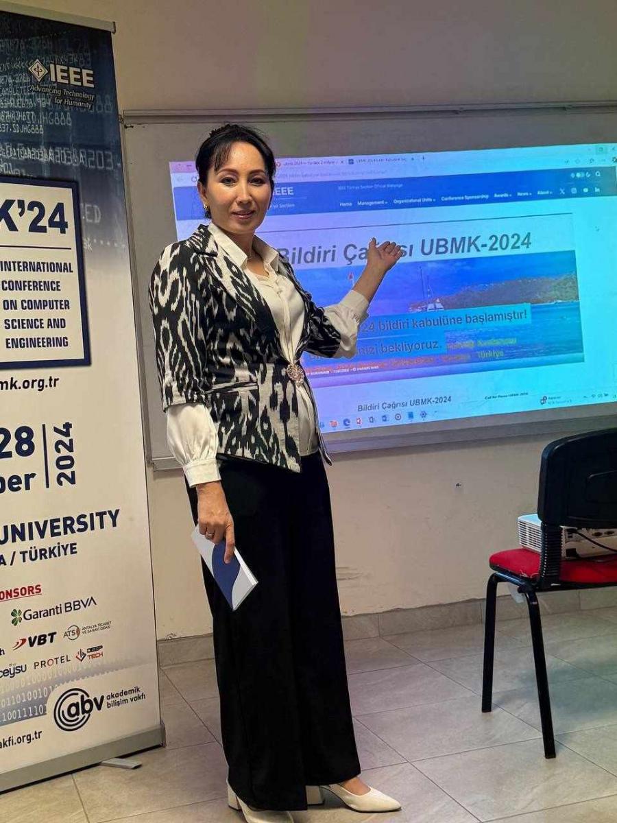 2024-yilning 26-29 oktabr kunlari Turkiyaning Antaliya shahridagi Akdeniz universitetida o‘tkazilgan “Xalqaro Kompyuter Fanlari va Muhandisligi IX” (UBMK 2024) konferensiyasida Alisher Navoiy nomidagi Toshkent davlat o‘zbek tili va adabiyoti universitetining dotsenti, filologiya fanlari doktori (DSc) Abjalova Manzura o'z shogirdlari N.G‘ulomova, M.Adilova va S.Sharipova bilan birgalikda bir qator muhim mavzularda maqolalar taqdim etdilar.