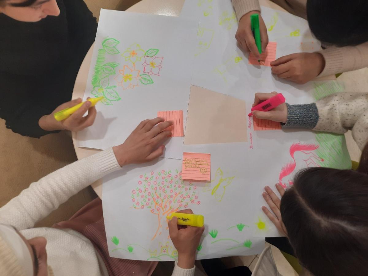 Talaba qizlar treningda o'zlarining qobiliyatlarini o'zlari uchun ham kashf etdilar. Ranglar ularning kayfiyatlarini aks ettirsa, shakllar ularning ruhiy holatlarini ko'rsatadi.