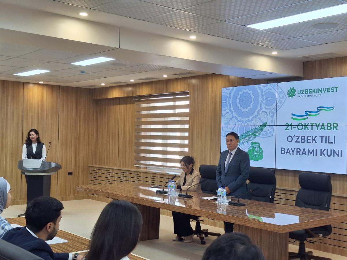 "Uzbekinvest" sug'urta kompaniyasida 21-oktabr "O'zbek tili bayrami" kuni munosabati bilan tadbir va xodimlar o'rtasida bellashuv o'tkazildi. Dastlab, kompaniya bosh direktori Rustam Azimov tadbir qatnashchilarini bayram bilan qutladi. Yurtimizda ona tilimizga bo'lgan e'tibor, fuqarolarning davlat tiliga munosabati xususida alohida to'xtalib o'tdi.