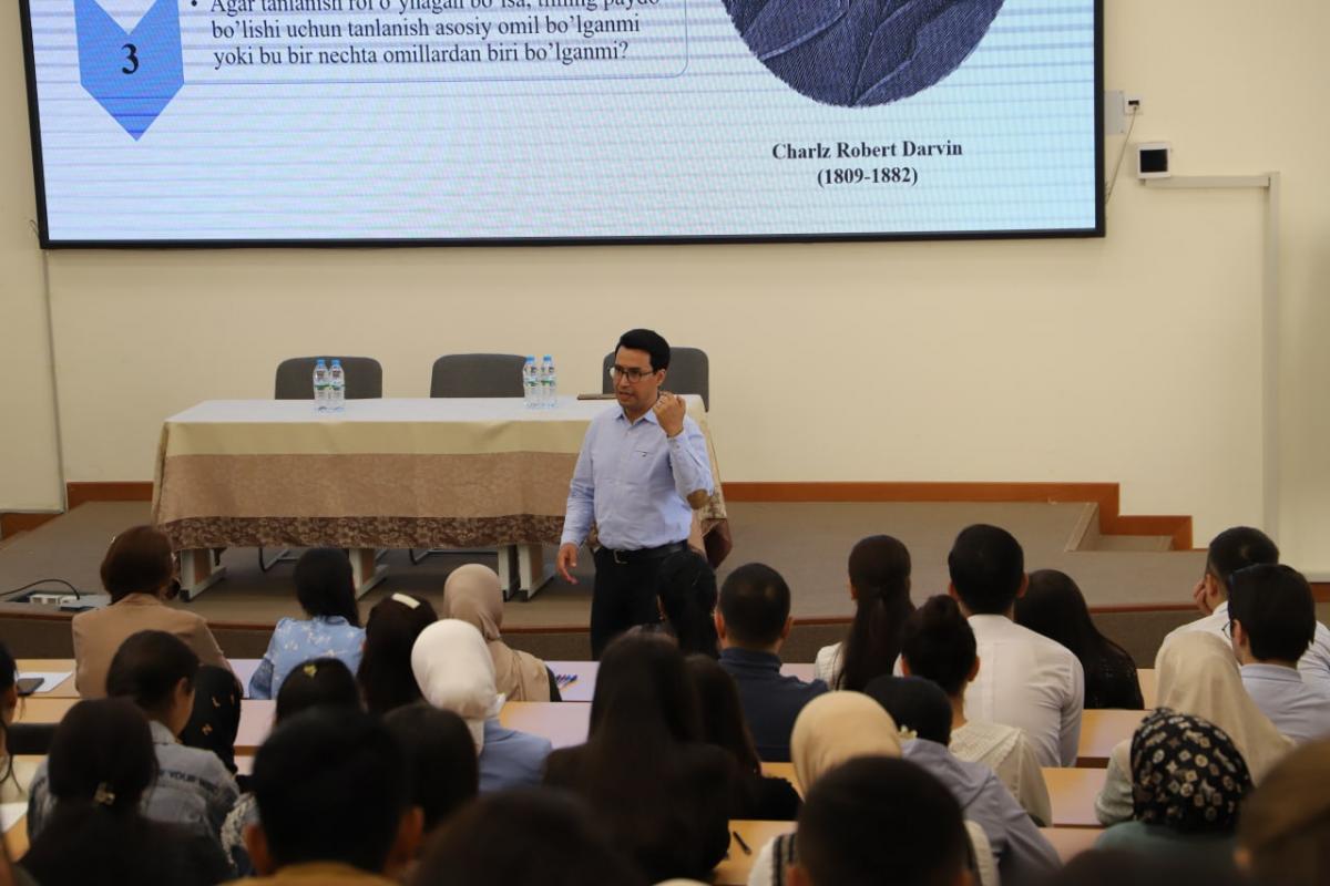 2022 - yil 6 - oktabr kuni O‘zbek tili ta’limi fakulteti O‘zga tilli guruhlarda o‘zbek tili 1-kurs talabalari uchun tilshunoslik asoslari fanidan “Biolingvistika: zamonaviy ilm-fan bizdan nima kutmoqda?” mavzusidagi binar ma’ruza bo‘lib o‘tdi. Unda ma’ruzachilar prof. Saodat Muhamedova hamkor ma’ruzachi sifatida biologiya fanlari bo‘yicha falsafa doktori (PhD), Xitoyning Chongqing shahridagi Janubiy-g‘arbiy universitet PostDok tadqiqotchisi Baxtiyor Sheraliyev mashg‘ulot olib borishdi. Juda qiziqarli, mazmunli, interaktiv tarzda o‘tkazilgan mazkur binar ma’ruzada til evolyutsiyasi va biologik turlar evolyutsiyasidagi o‘xshash qonuniyatlar, lingvistika va biologiya fanlari o‘zaro integratsiya qilgan soha - biolingvistika, aniq va ijtimoiy fanlarning ayni vaqtdagi holati, biz nimalarga tayyor turishimiz va bizdan nimalar kutilayotgani haqida fikrlar bildirildi.