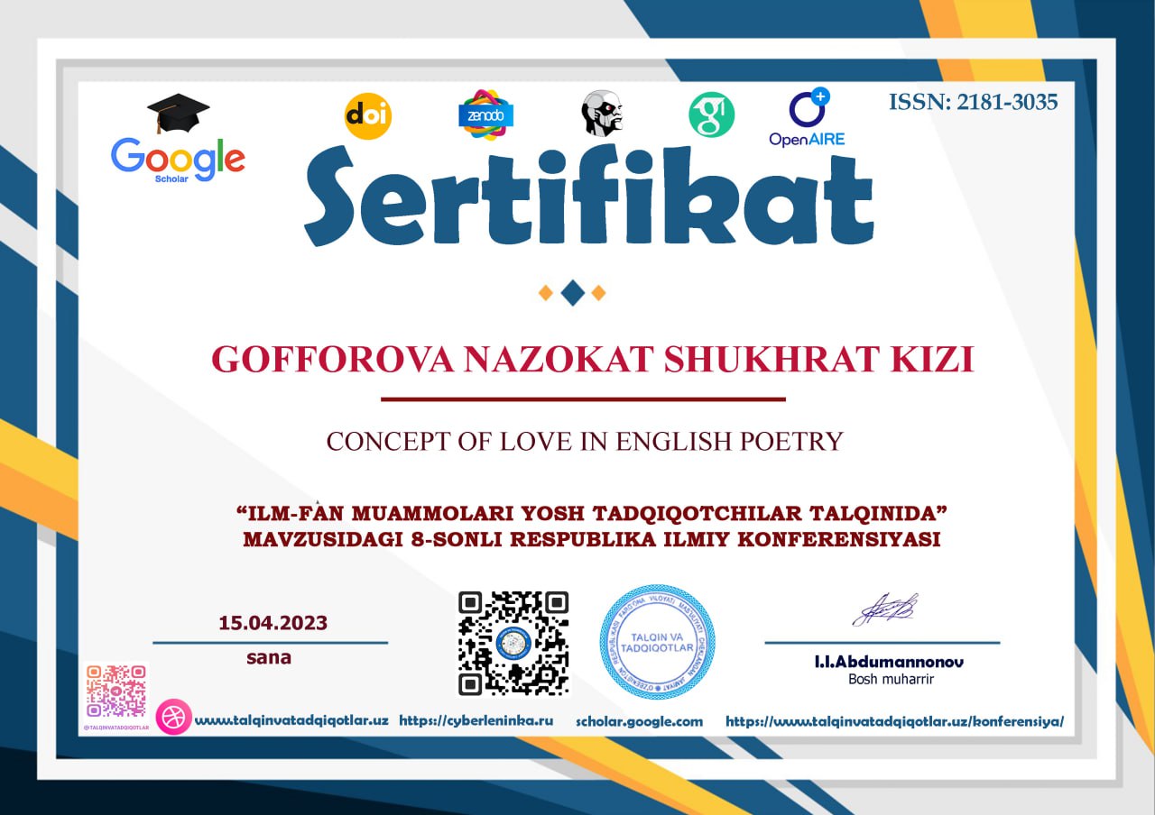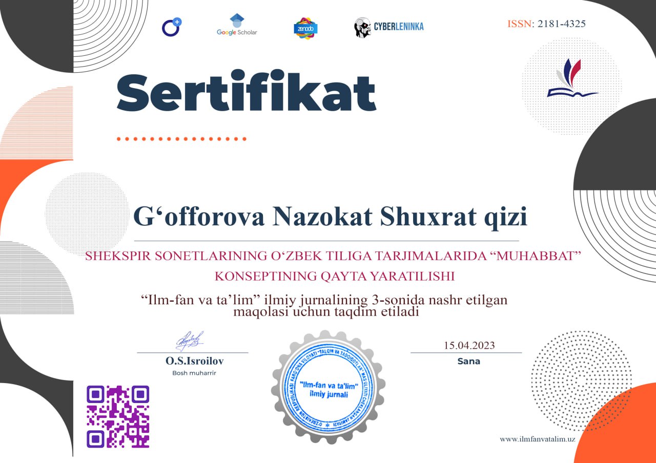 Alisher Navoiy nomidagi Toshkent davlat o‘zbek tili va adabiyoti universiteti stajo‘r- o‘qituvchi lavozimida ishlab kelmoqda
