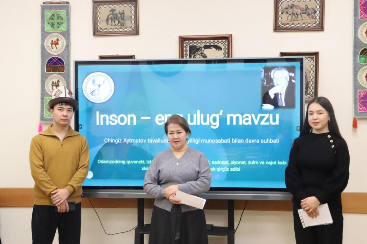 2025-yilning 12-dekabr kuni Alisher Navoiy nomidagi Toshkent davlat o‘zbek tili va adabiyoti universiteti qoshidagi Qirg‘iz tili va madaniyati markazi hamda O‘sh davlat universiteti huzuridagi O‘zbek tili va madaniyati markazi hamkorligida buyuk yozuvchi va jamoat arbobi Chingiz Aytmatov tavalludining 97 yilligi munosabati bilan “Inson – eng buyuk mavzu” nomli davra suhbati bo‘lib o‘tdi. Tadbirda ikki universitet professor-o‘qituvchilari va talabalari ishtirok etdilar.