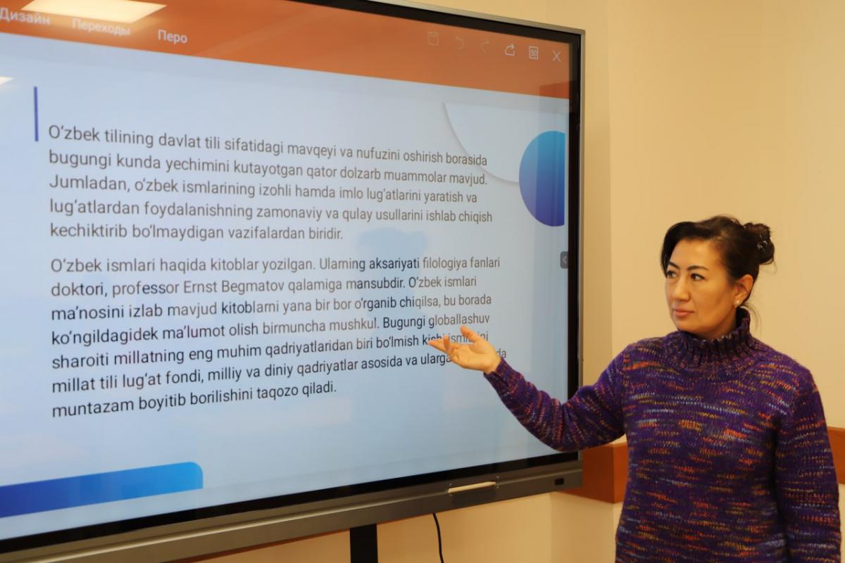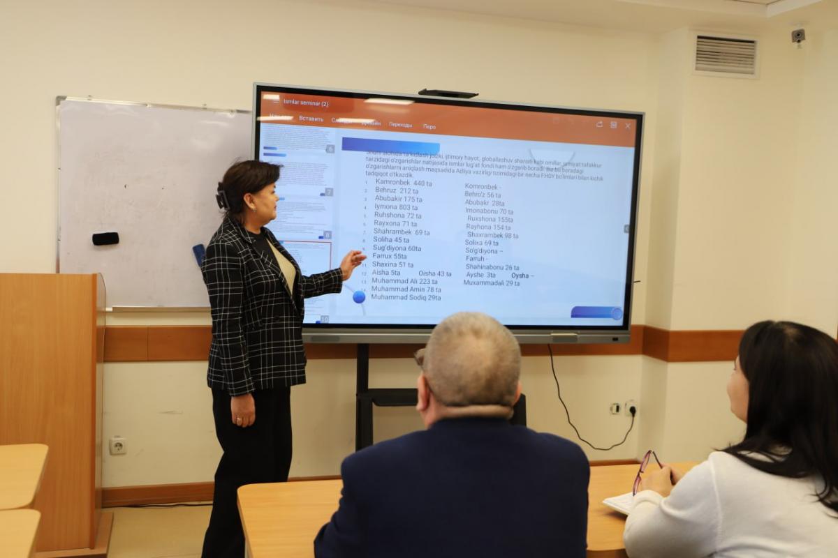 2023-yil 11-yanvar kuni O‘zbek tili ta’limi fakulteti O‘zga tilli guruhlarda o‘zbek tili ta’limi kafedrasida nazariy-metodologik seminar bo‘lib o‘tdi. Seminarda filologiya fanlari nomzodi, dotsent Muyassar Saparniyazova “Ayrim o‘zbek ismlarining imlosiga doir”, katta o‘qituvchi Gulbahor Iskandarova “O‘zbek tilini xorijliklarga o‘qitishda o‘yin texnologiyalarining o‘rni” mavzularida ma’ruza qilishdi. Bugungi globallashuv sharoiti millatning eng muhim qadriyatlaridan biri bo‘lmish kishi ismlarini millat tili lug‘at fondi, milliy va diniy qadriyatlar asosida va ularga mos tarzda muntazam boyitib borilishini taqozo qiladi. Seminarda universitetda bajarilayotgan “O‘zbek ismlarining izohli imlo lug‘ati va mobil ilovasini yaratish” loyihasi doirasida olib borilayotgan ishlar, Adliya vazirligi tizimidagi FHDY bo‘limlari bilan o‘tkazilgan tadqiqotlar, ismlarni qayd qilish jarayonidagi muammolar, ismlar imlosi va ma’nolari izohidagi ayrim masalalar tahlil qilindi. Seminar bahs-munozaralarga boy bo‘ldi. Professor-o‘qituvchilar o‘z fikr-mulohazalarini, takliflarini bildirishdi.