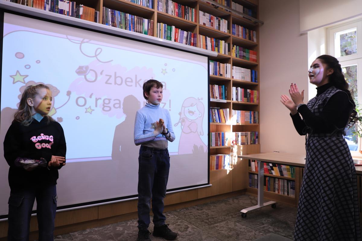 Respublika bolalar kutubxonasida "O'zbek maktabi" tomonidan tashkil etilayotgan "O'zbekcha gapiramiz" to'garagining navbatdagi mashg'ulotlari bo'lib o'tdi. Asosan rusiyzabon bolajonlar uchun chinakam sevimli mashg'ulotga aylanib borayotgan to'garakning bu galgi darslarini "O'zbek maktabi" mutaxassislari Shahnoza Nematova va Sevinch Qayumova olib borishdi. O'zbek tilini oson va tez o'rgaishga mo'ljallangan maxsus dastur asosida o'tkazilayotgan darslar oyda ikki marta, haftaning yakshanba kunlari bo'lib o'tmoqda. Mashg'ulotlar mutlaqo bepul. Bu to'garak haqida eshitgan ota-onalar o'z farzandlari "O'zbekcha gapiramiz" toʻgaragiga olib kelishmoqda.