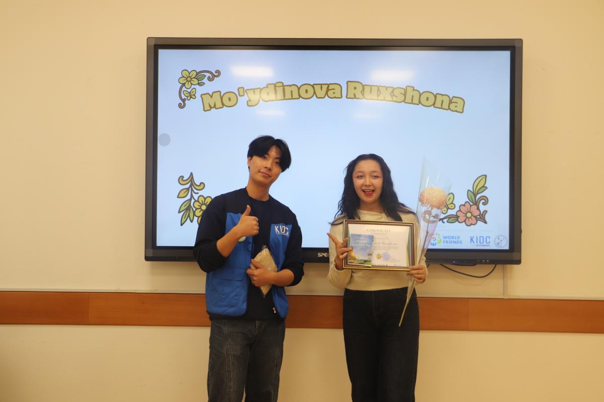 Kuni kecha ko‘ngillilar o‘zbek shogirdlari bilan samimiy xayrlashuv darsini o‘tkazishdi. Dars davomida talabalar o‘zlari erishgan natijalar, o‘rgangan yangi bilimlar va taassurotlarini bo‘lishib, ustozlariga minnatdorlik bildirdilar. Mashg‘ulot yakunida talabalar koreys ko‘ngillilariga esdalik sovg‘alari taqdim etishdi. Bu uchrashuv talabalarning ko‘nglida iliq xotiralar qoldirdi va o‘zaro madaniy yaqinlikning yorqin ifodasiga aylandi.