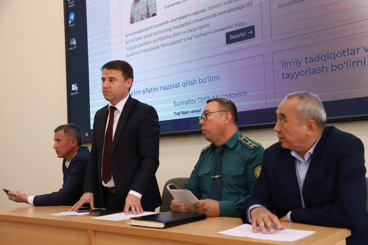 Joriy yilning 2-oktyabr kuni Alisher Navoiy nomidagi Toshkent davlat o'zbek tili va adabiyoti universitetida Masofaviy ta'lim shakliga qabul qilingan talabalar bilan uchrashuv bo'lib o'tdi. Uchrashuvda universitet o'quv ishlari bo'yicha prorektori S.Ermamatov, Korrupsiyaga qarshi kurashish “Komplayens-nazorat” tizimini boshqarish bo‘limi boshlig'i A.Nasriddinov, Masofavit ta'lim kafedrasi mas'ullari talabalarga o'quv jarayoni, ta'lim-tarbiya tizimi haqida ma'lumot berishdi. Korrupsiyaga qarshi kurashish “Komplayens-nazorat” tizimini boshqarish bo‘limi boshlig'i A.Nasriddinov Oliy ta'lim, fan va innovatsiyalar vazirligining "Korrupsiyasiz soha" loyihasi doirasida universitetda "Korrupsiya taraqqiyot kushandasi !" mavzusida suhbat o'tkazdi. Tadbirda O'quv ishlari bo'yicha prorektor S.Normamatov, masofaviy ta'lim fakulteti dekani N.Chinniqulov, universitet profilaktika inspektori, podpolkovnik M.Qurbonovlar ishtirok etishdi. Tadbir didavomida Oʻzbekiston Respublikasining "Korrupsiyaga qarshi kurashish toʻgʻrisida"gi Qonuni va uning mazmun-mohiyati haqida hamda mamlakatimizda korrupsiyaga qarshi kurashish borasida amalga oshirilayotgan islohotlar to'g'risida ma'lumotlar berib oʻtildi. uchrashuv yakunida talabalarni qiziqtirgan savollariga javoblar berildi.