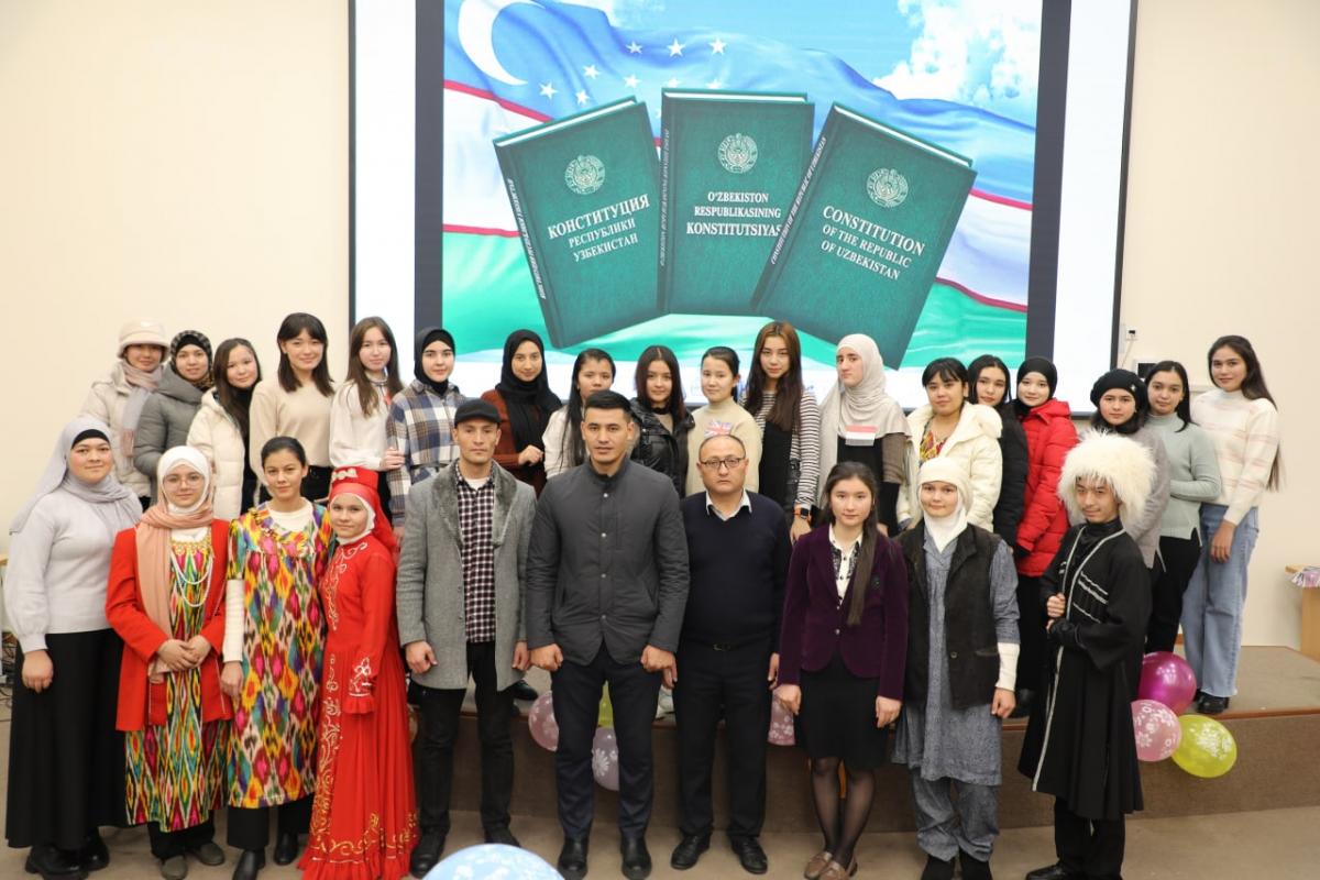 Ona tili va adabiyot ta'limi hamda Tarjima nazariyasi va amaliyoti fakultetlari talabalari tomonidan tayyorlangan badiiy-ma'rifiy kompozitsiyada bosh qomusimiz moddalari, xalq manfaatlarini ta'minlashdagi muhim huquqiy asosligi takidlandi. Bir-biridan qiziqarli viktorinalar, kuy-qo'shiq, raqslar, quvnoqlar va zukkolar jamoalarining chiqishlari barchaga birdek manzur bo‘ldi.