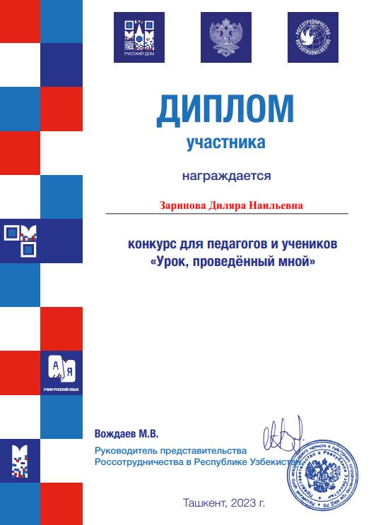 Toshkent davlat o‘zbek tili va adabiyoti universiteti O‘zga tilli guruhlarda o‘zbek tili ta’lim yo‘nalishi 4-kurs talabalari kommunikativ rus tili kursini yaxshi o‘zlashtirish barobarida "Rossotrudnichestvo"ning Toshkentdagi vakolatxonasi tomonidan pedagog va talabalar o‘rtasida o‘tkazilgan "Mening darsim" xalqaro tanlovida muvaffaqiyatli qatnashishdi. Talabalar mazkur kurs o‘qituvchisi D.N.Zaripovaning ilmiy rahbarligida o‘zlari o‘tgan an'anaviy darslarni video tasvirga oldilar. Ushbu videolavhalar nufuzli hakamlar hukmiga havola qilindi. Ular o‘z darslarida zamonaviy vizual materiallar, internet imkoniyatlari, didaktik tarqatmalardan foydalangan holda rus tilida mavzuni tushuntirish, shuningdek, o'quvchilar tomonidan bajarilgan topshiriqlarni tekshirish kabi jarayonlarni yuqori mahorat bilan bajarishdi. Talabalar rus tili darslarida o‘z bilimlarini namoyish etib, belgilangan maqsadni muvaffaqiyatli bajarganliklari sababli hakamlarning ijobiy e’tirofiga sazovor bo‘lishdi va Rossotrudnichestvo tomonidan faxriy diplomlar bilan taqdirlanishdi.