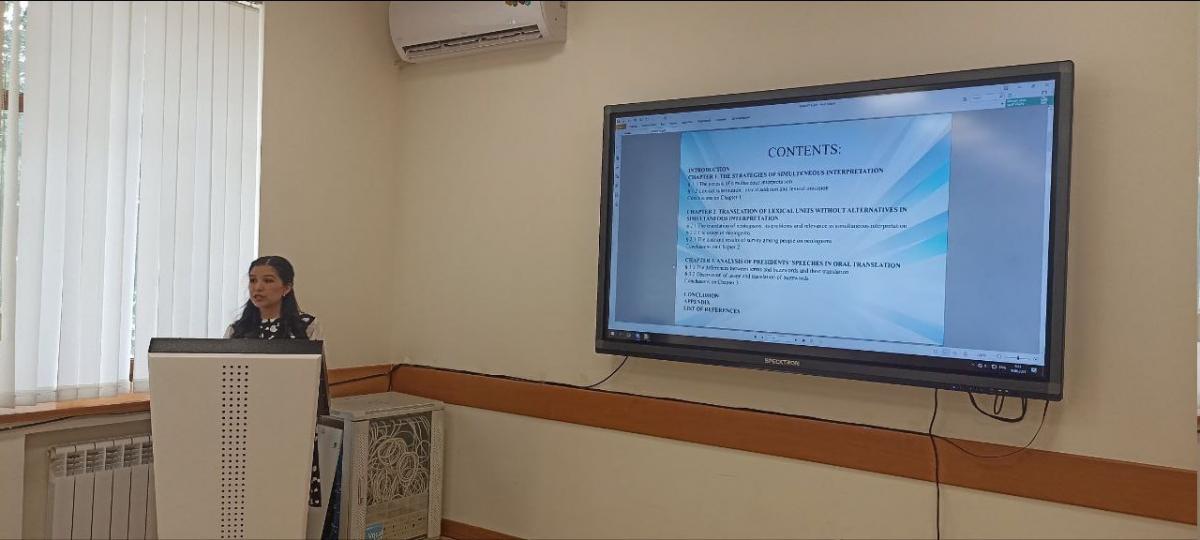 Sinxron tarjima(ingliz tili) mutaxassisligi magistranti Mariya Sarsenbayeva o‘zining "Linguocognitive Problems of Conference Interpreting" mavzusidagi dissertatsiyasida Xalqaro va o‘zbek talabalari miqyosida konferens-tarjimaning lingvokognitiv muammolarini juda yaxshi yoritib berdi.